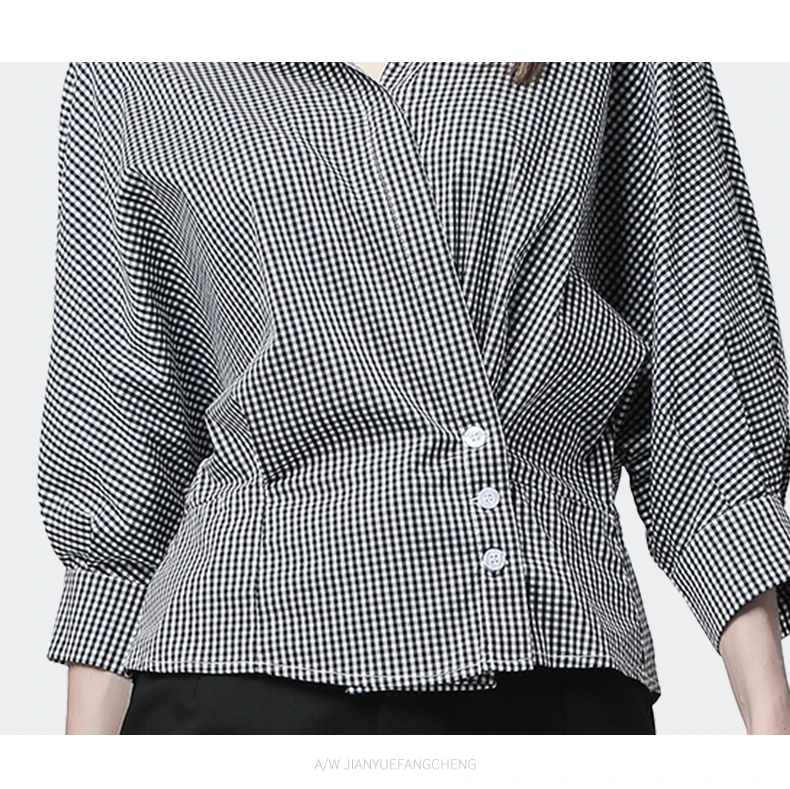 Женская рубашка в клетку серого цвета с 7/10 рукавами и отложным воротником размера плюс на весну и лето 2019