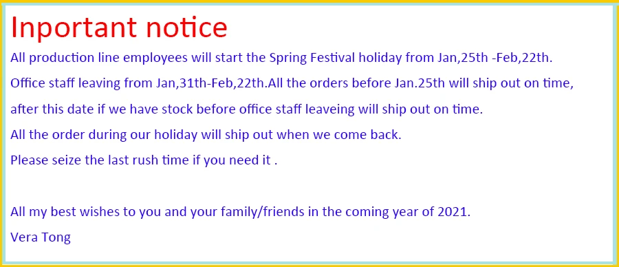 4. Пожалуйста, не открывайте спор или не пишите плохой или нейтральный отзыв напрямую, не связавшись с нами.У вас есть наши слова здесь: все проблемы могут быть решены путем хорошего общения, мы надеемся, что все наши клиенты могут удовлетворить наши продукты и услуги. Если у вас есть какие-либо проблемы с нашими продуктами или обслуживанием, пожалуйста, сначала свяжитесь с нами, и мы предоставим вам идеальное решение.