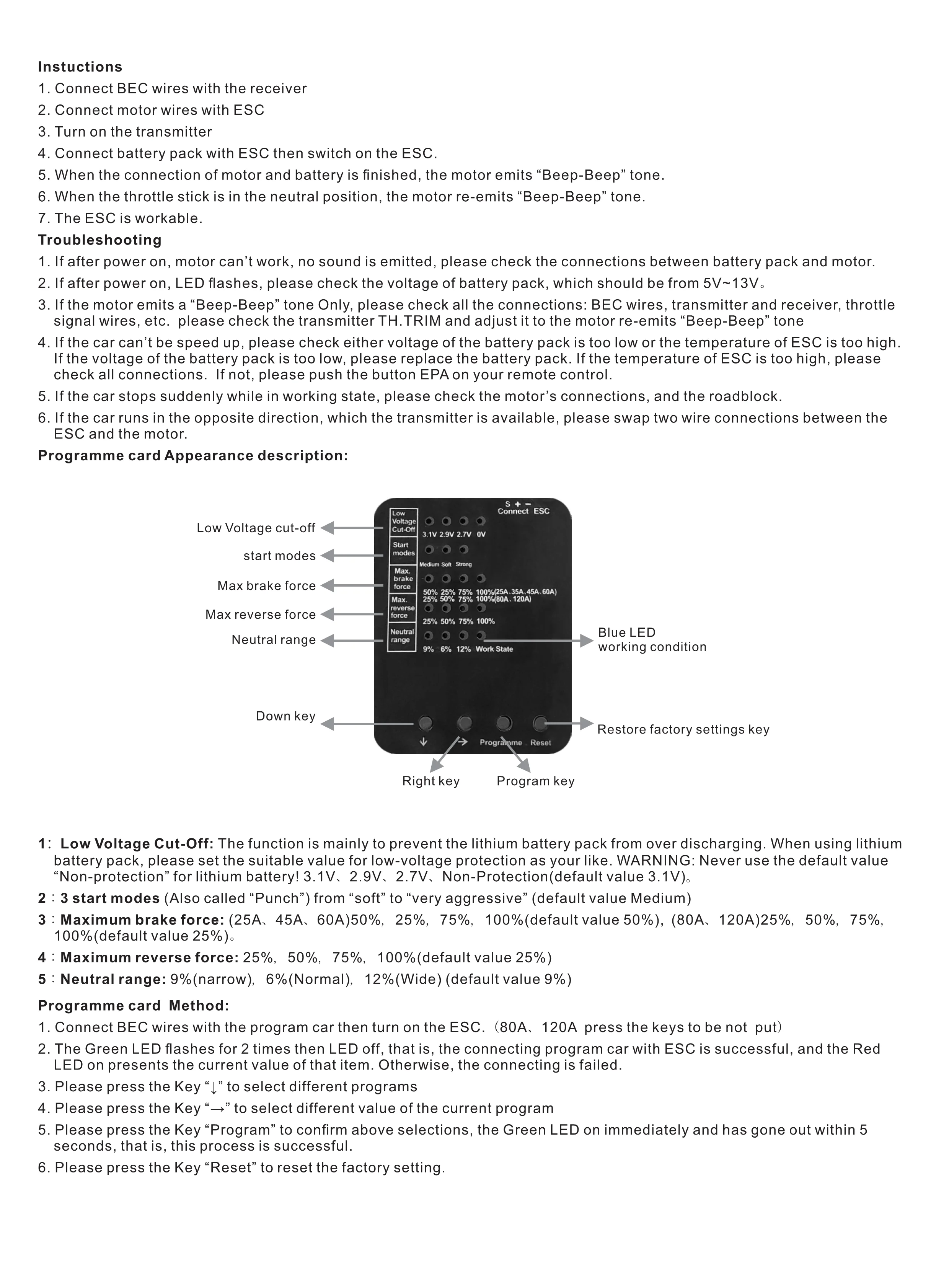 5. Несколько функций защиты: защита от отключения низкого напряжения для литиевых или никель-кадмиевых батарей/Защита от перегрева/Защита от потери сигнала дроссельной заслонки./Защита от блокирования двигателя.