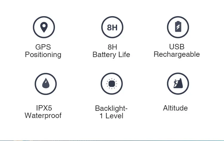 1. Монохромный ЖК-дисплей 1,6 дюйма, хороший эффект дисплея под солнцем; 2. Белая подсветка; 3. GPS высокого качества внутри; 4. Скорость, высота, DST, время езды, ODO и т. д.; 5. Список катания на велосипеде для просмотра; 6. Перезаряжаемый через USB аккумулятор 400 мАч; 7. Водонепроницаемость IPX6;