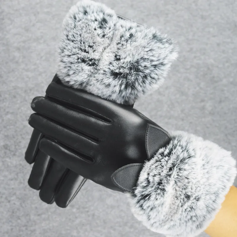 Женские черные кожаные перчатки осень зима кошачьи уши теплые кроличьи меховые варежки