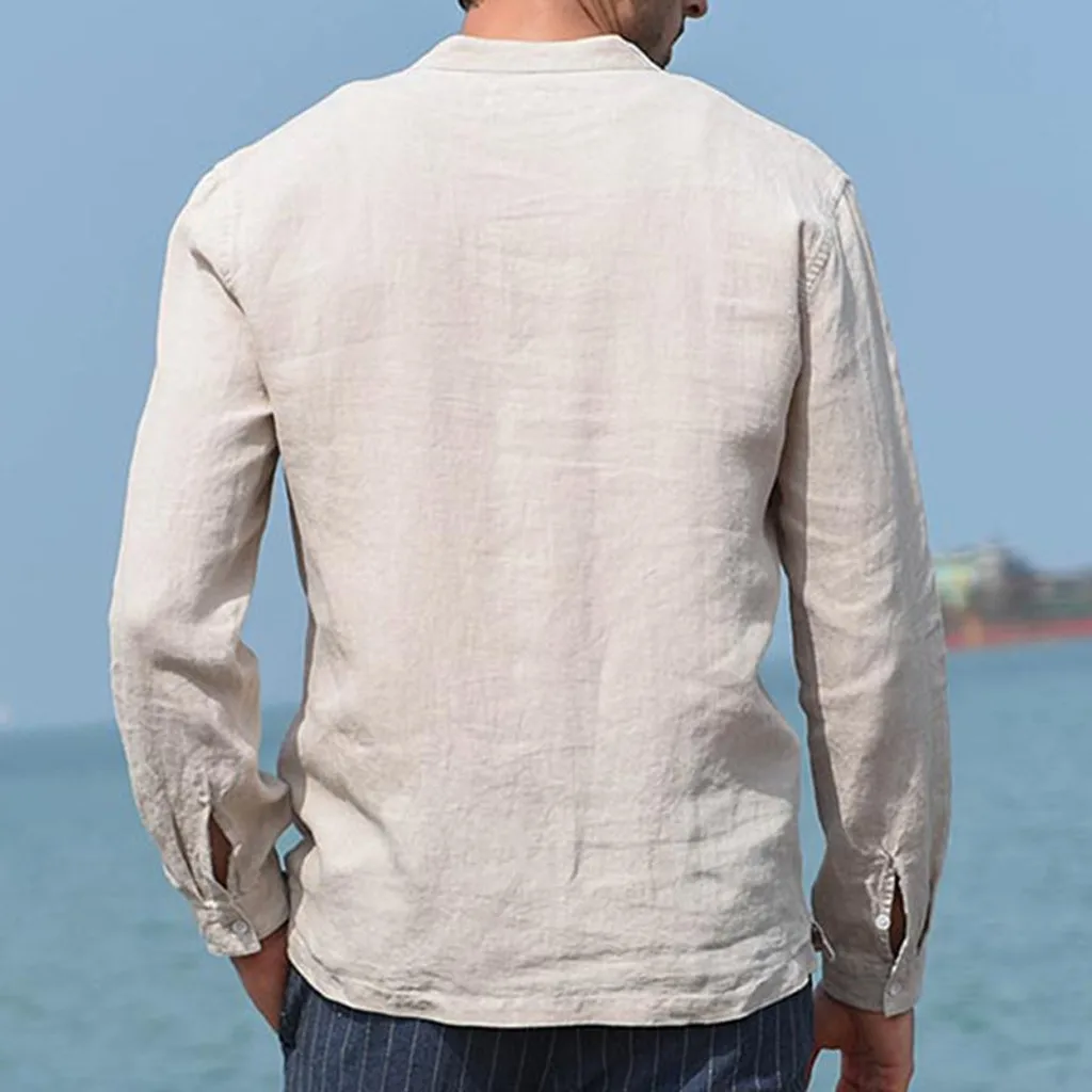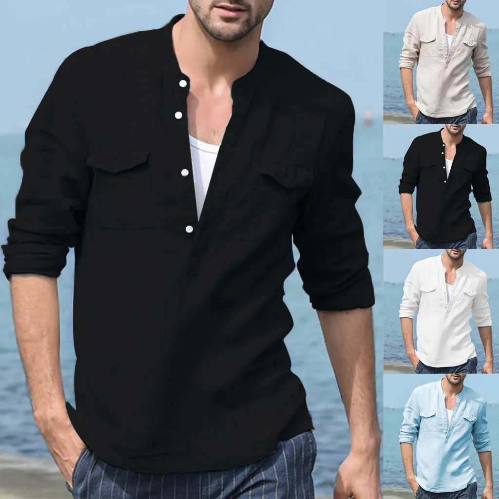 Мужские Мешковатые хлопковые льняные однотонные футболки с карманами и длинными рукавами в стиле ретро, топы, блузки
