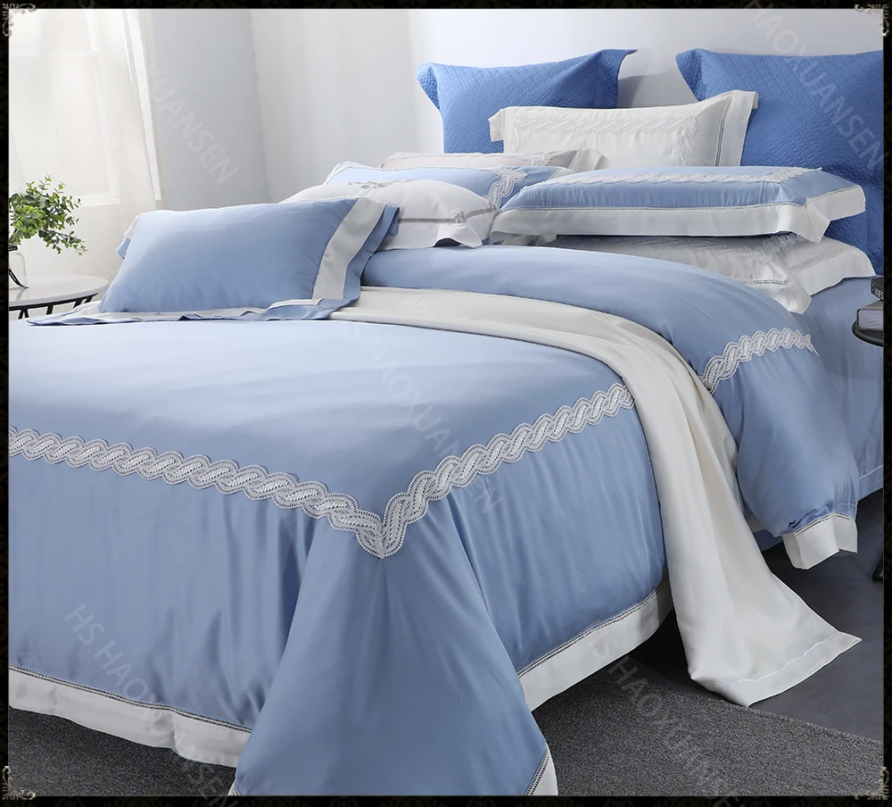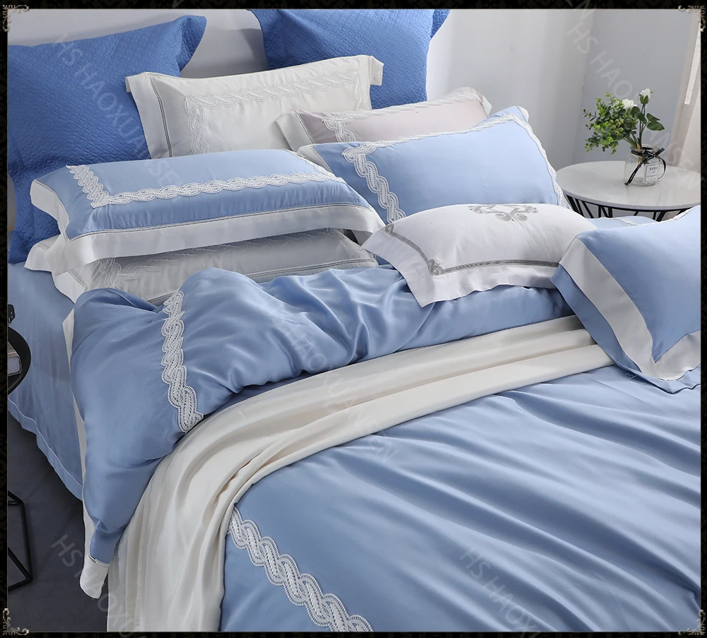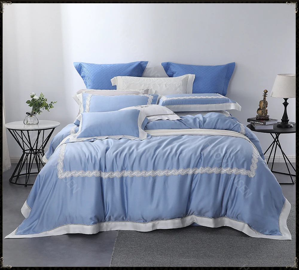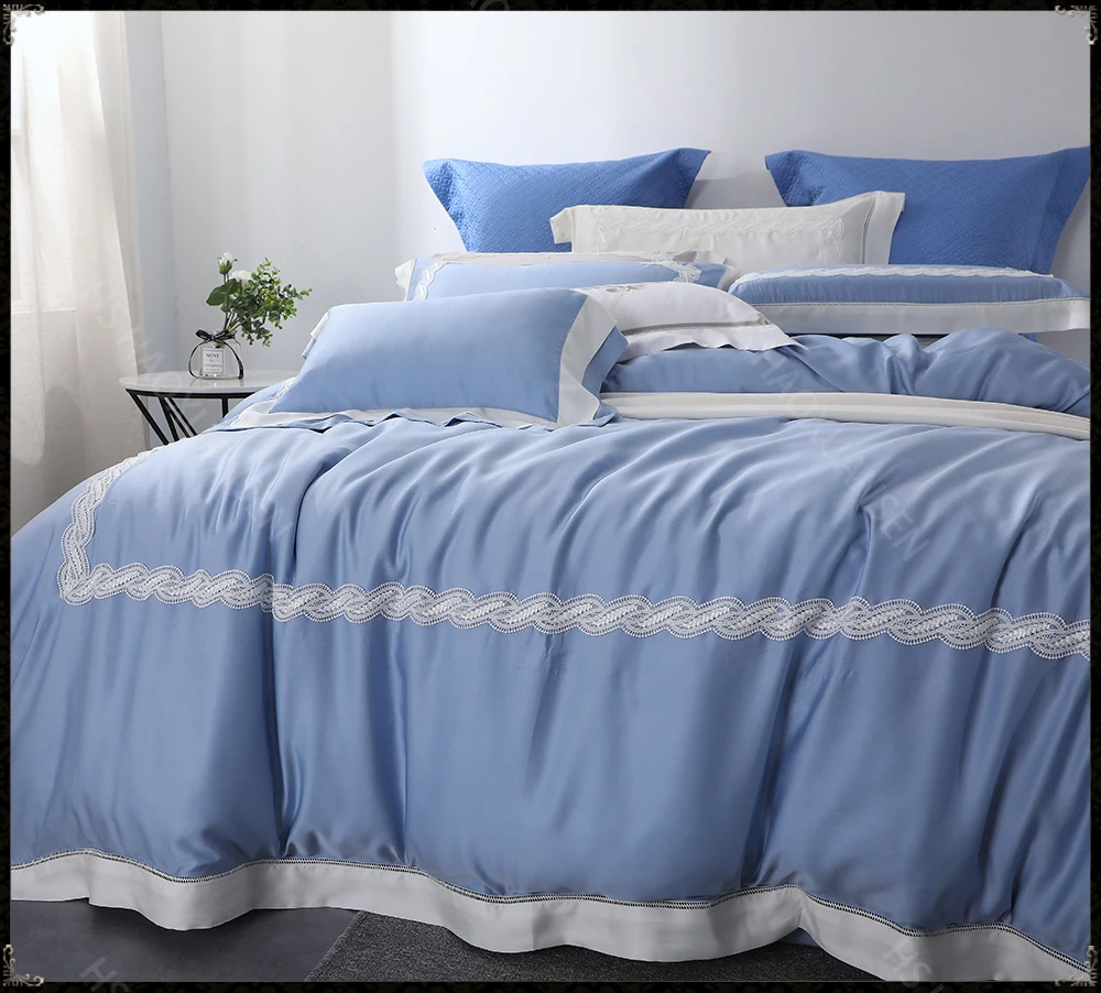 Натуральный органический шелковистый мягкий 100% Tencel Lyocell комплект из 4 предметов голубого постельного белья, с использованием высококачественной модной кружевной каймы серебристого цвета с вышивкой, с одинаковым цветом изысканного дизайна с вырезами, так что ваша комната полна неясности и загадочности, тем самым показывая сексуальность и красоту женщин. Наши вышивальные шнурки имеют светильник и прозрачную текстуру, мягкие в ручке, хорошо эластичны и устойчивы к размерам.