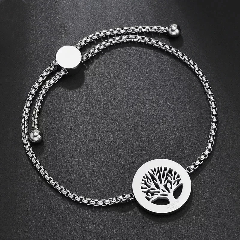Luxury Tree of Life Bracelets Women Stainless Steel Box Chain Bead Bracelet Bangle Inlay Rhinestone Adjustable Jewelry Gift