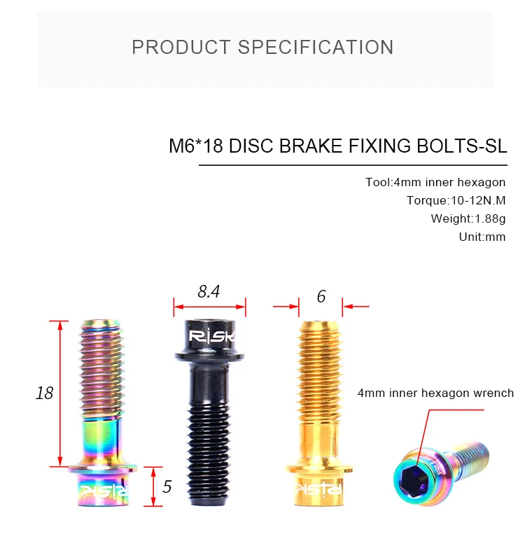 Спецификация: M6x18-SL Материал: титановый сплав Упаковка: 4 шт/коробка Цвет: черный, золотой, Радужный Крутящий момент: 10-12N.M Подходит для: зажима дискового тормоза, сиденья для передачи A/B и фиксации некоторых стержней.