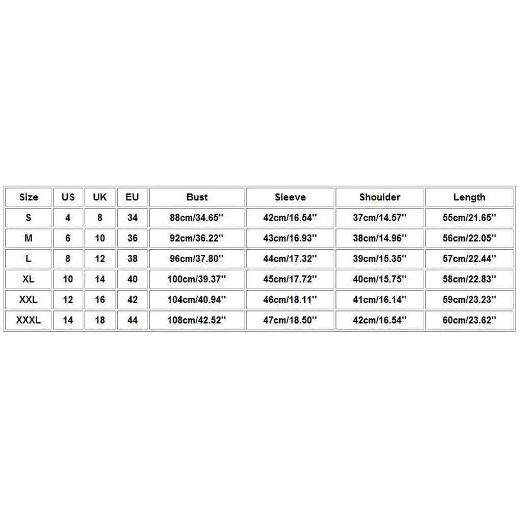 | Размеры: XXXL | Свяжитесь с нами: 14 | Великобритания: 18 | ЕС: 44 | Бюст: 108 см/42,52 дюйма | Рукав: 47 см/18,50 дюйма | Плечо: 42 см/16,54 дюйма | Длина: 60 см/23,62 дюйма |