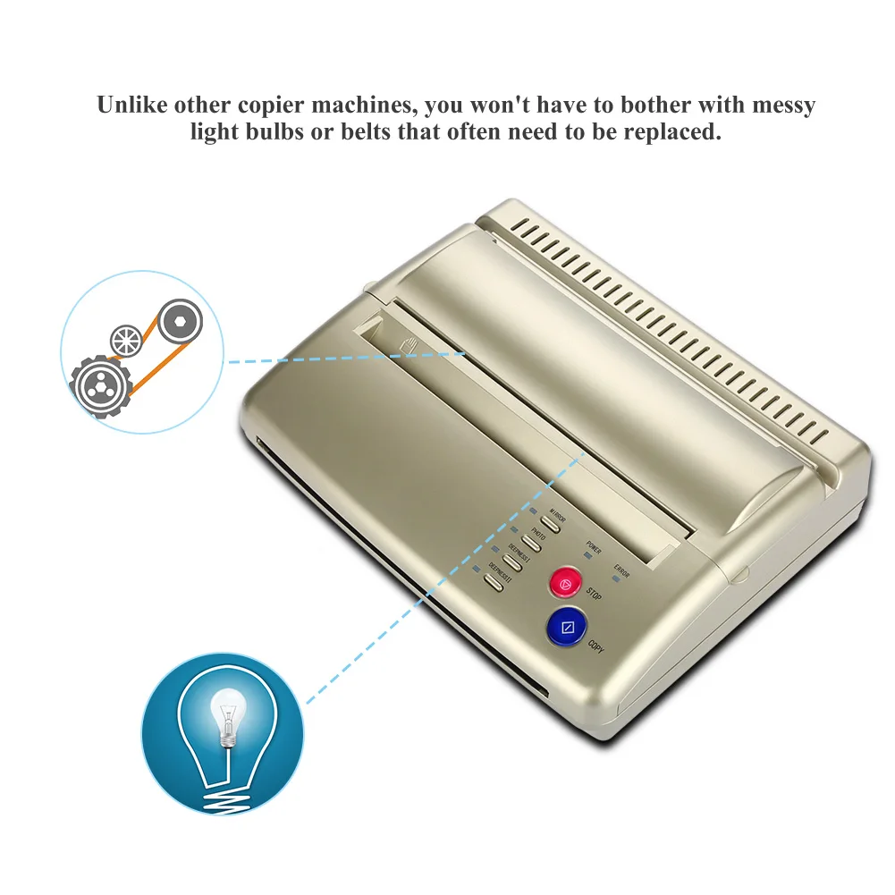 Этот копир создан специально для тату-художника. В отличие от других копировальной машины, вы не должны беспокоиться в светильник лампы или ремнями, которые часто нужно заменить.