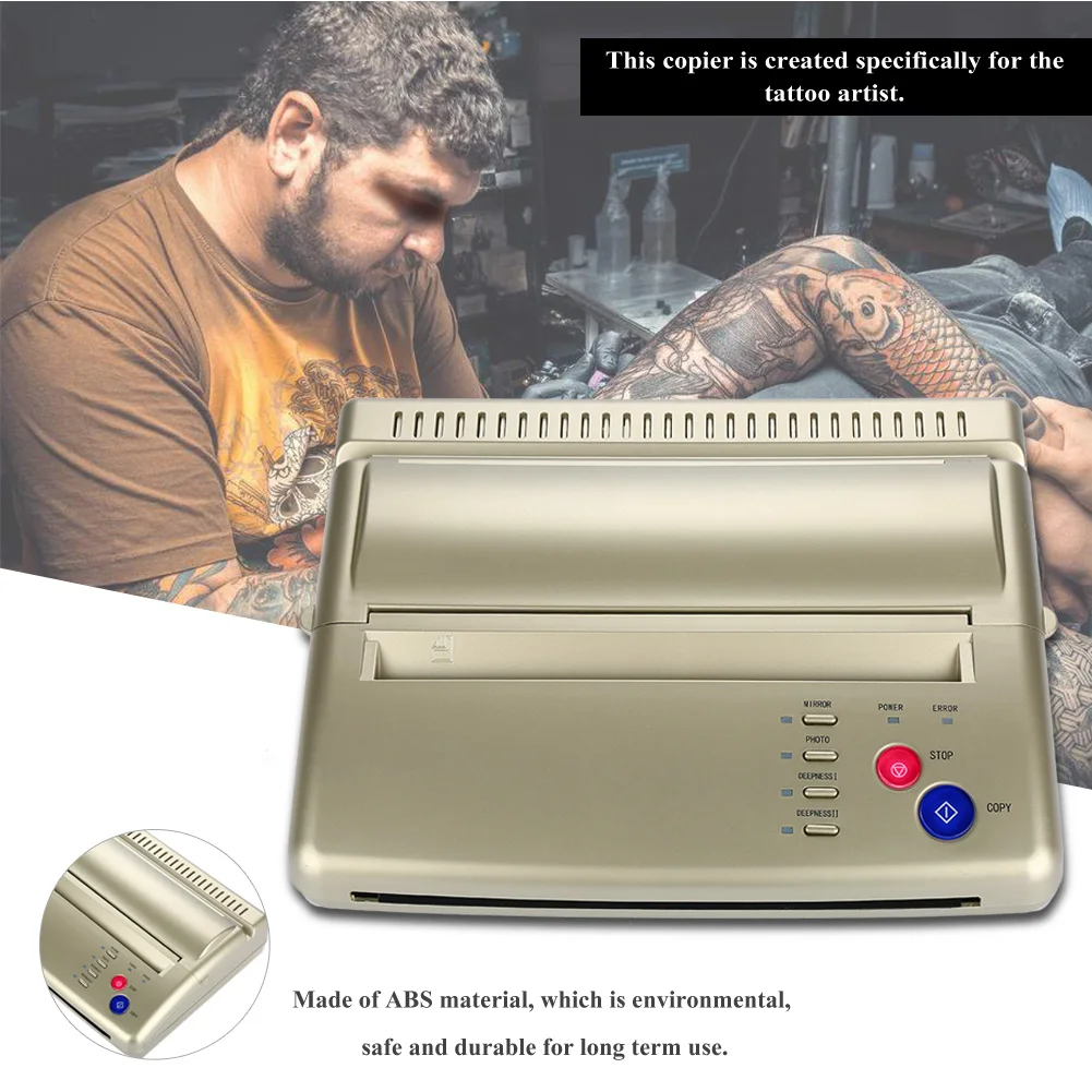 100% абсолютно новая и высококачественная машинка для переноса татуировок предназначена для обычной тату-бумаги и фотокопии, обеспечивая быструю и эффективную переводную печать, специально для бумажных документов или фотографий со сложными узорами. Это действительно хороший помощник для татуировщика.