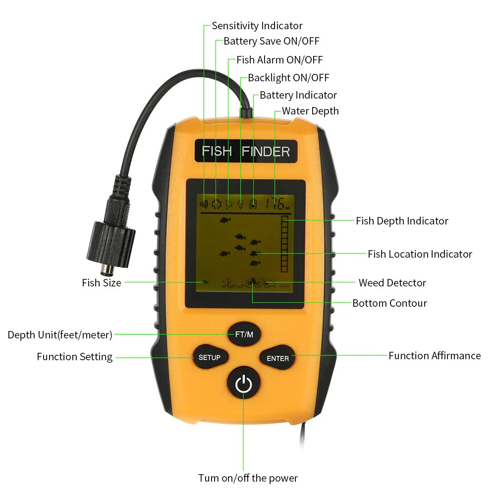 Информация о продукте: 1. Размер: 120*65*30 мм 2. Вес нетто: 428 г 3. Вес упаковки: 565 г 4. Размер упаковки: 260*175*65 мм 5. Обнаружение и отображение травы, коротких и высоких сорняков, песка и камней на морском дне 6. Получите приблизительное расположение рыбы и глубину воды 7. Круглый датчик с кабелем 7,5 м, угол луча 45 градусов 8. Со шкалой глубины рыбы и звуковым сигналом 9. Пользовательский выбираемый метр или показания ног 10. Дальность считывания глубины от 0,7 метров до 100 метров 11. Дисплей нижней скалы или травы 12. Съемный поплавок Особенности: 1. Обнаружение и отображение травы, коротких и высоких сорняков, песка и камней на морском дне 2. Получите приблизительное расположение рыбы и глубину воды 3. Круглый датчик датчика с кабелем 7,5 м, угол луча 45 градусов 4. Со шкалой глубины рыбы и звуковым сигналом 5. Пользовательский выбираемый метр или показания ног 6. Дальность считывания глубины от 0,7 метров до 100 метров 7. Отображение нижней скалы или травы 8. Съемный поплавок