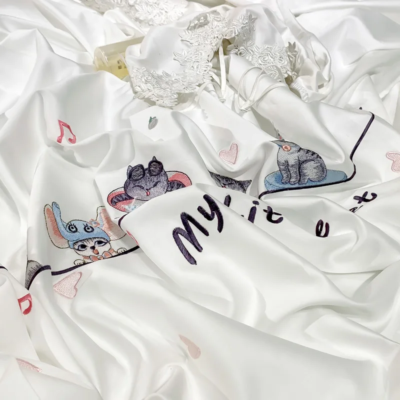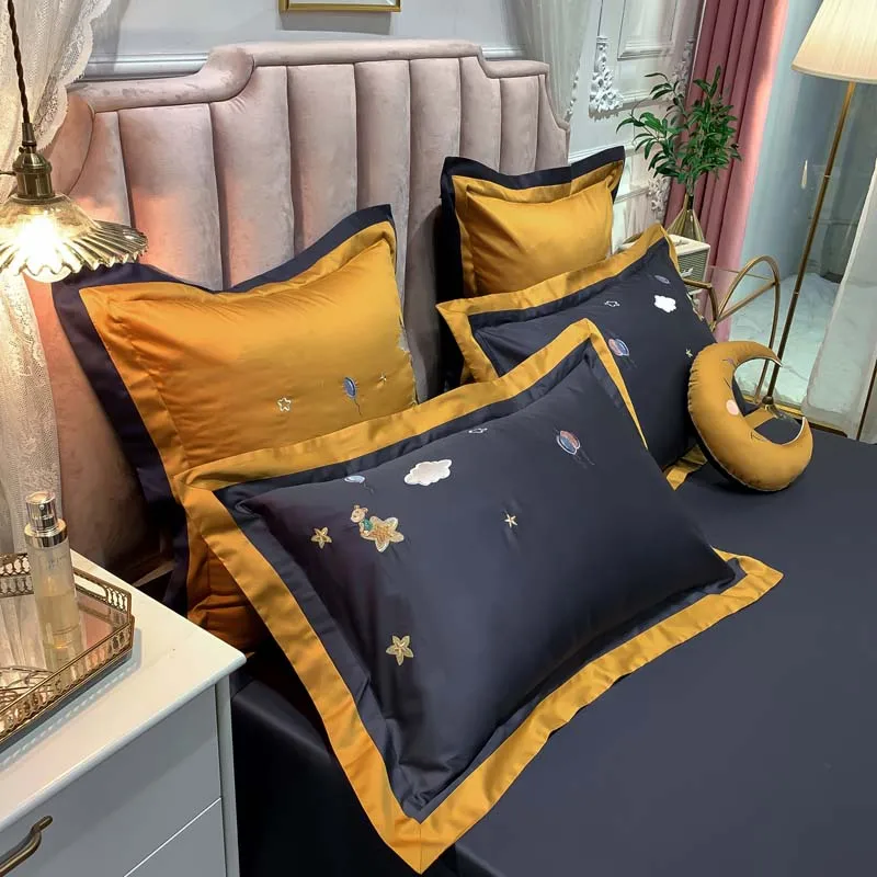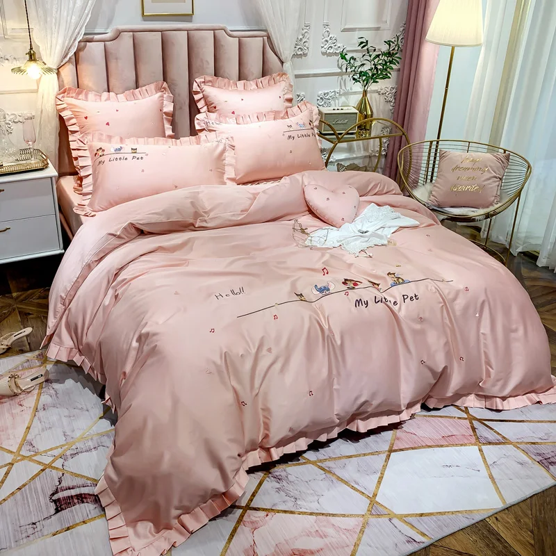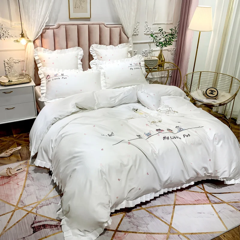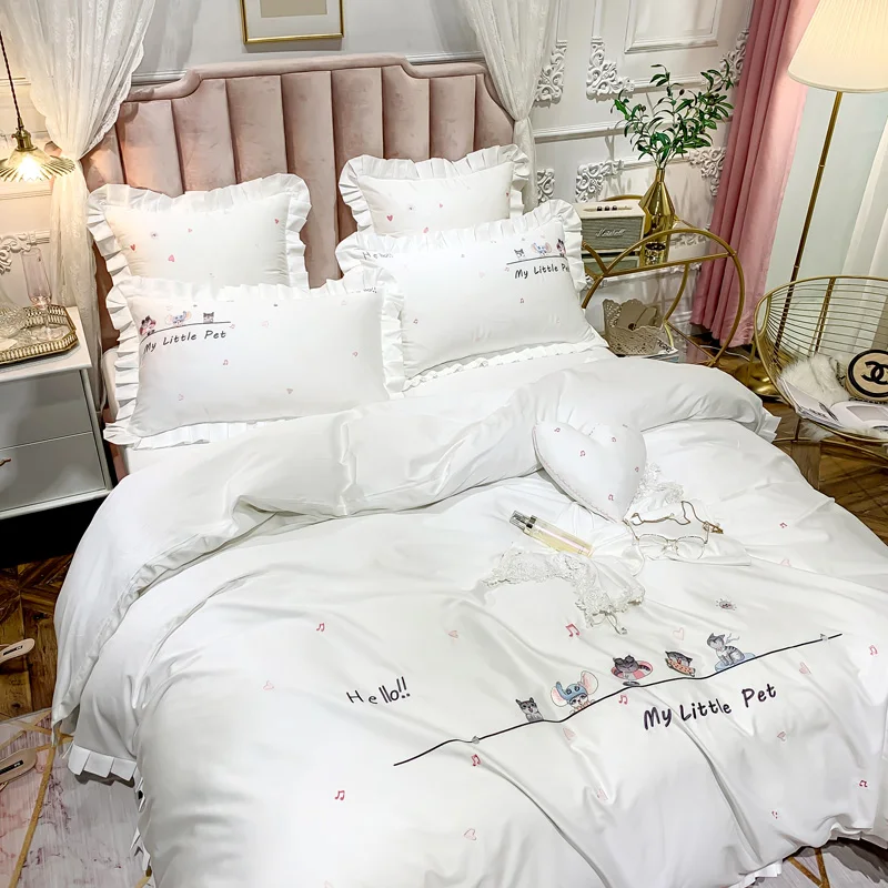 1 piece Duvet Cover: 200*230cm(79*91inches) 1 piece Flat sheet:245*250(96*98inches) 2 pieces Pillowcases:48*74cm(19*30inches) King size 4pcs 1 piece Duvet Cover: 220*240cm(87*94inches) 1 piece Flat sheet:245*270(96*106inches)2 pieces Pillowcases:48*74cm(19*30inches)