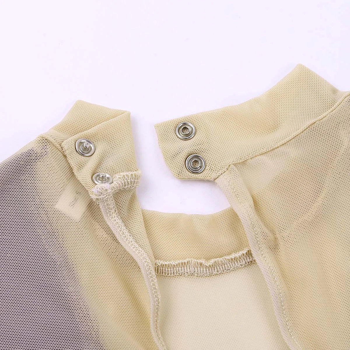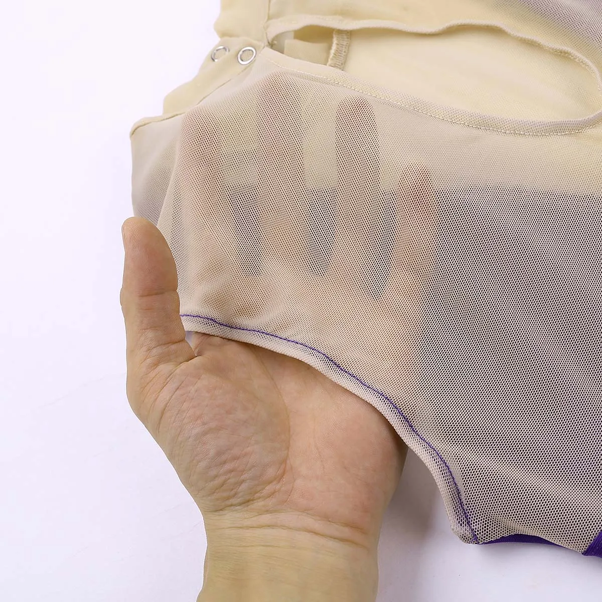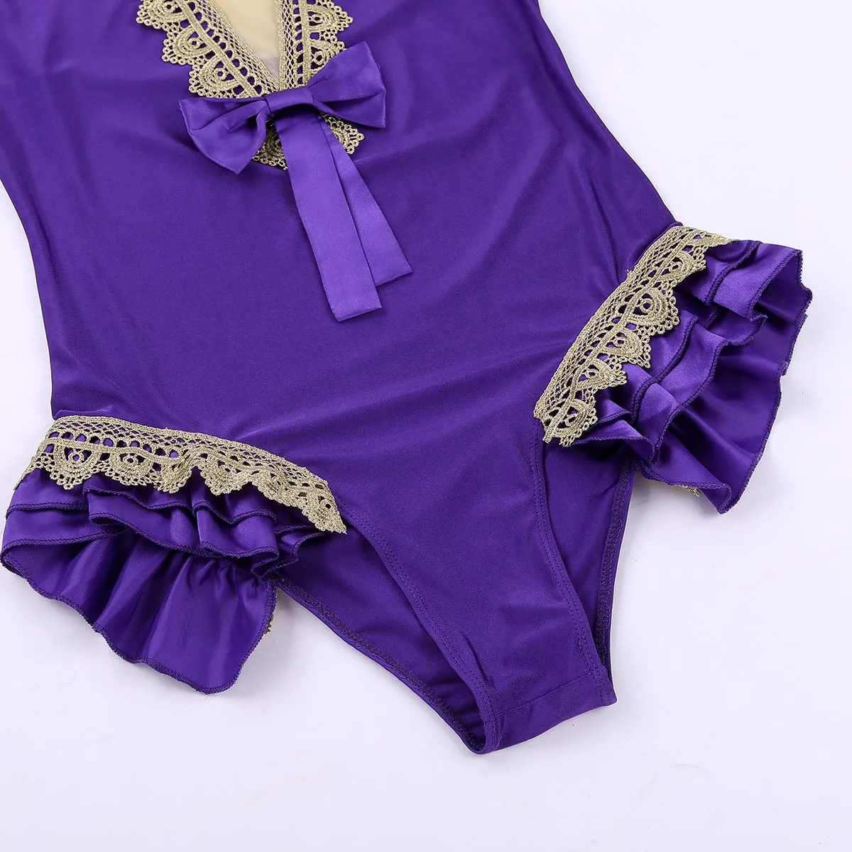 Купальник без рукавов, спереди с v-образной сеткой и золотистой оплеткой, сзади также с сетчатым соединением, гофрированными отверстиями для ног.