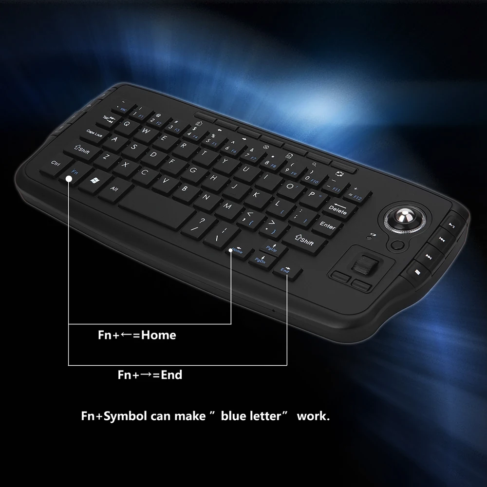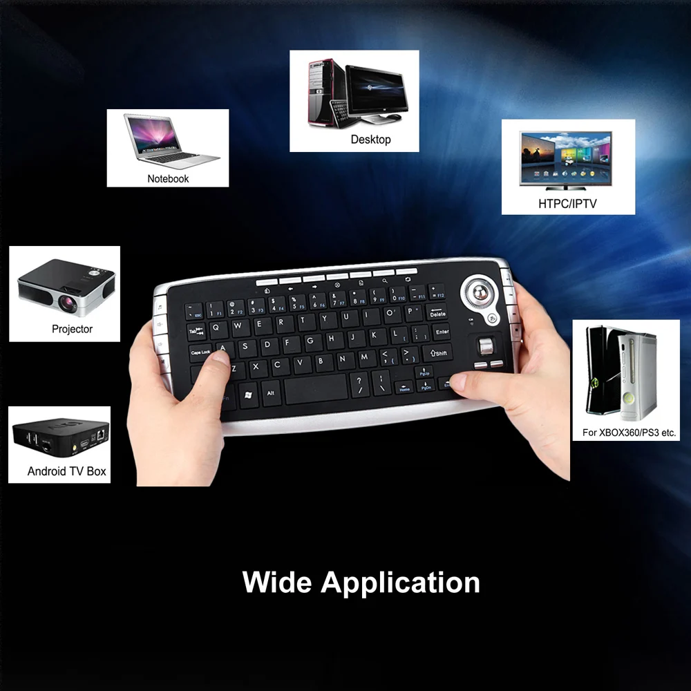 Это 2,4 ГГц Беспроводная мини-клавиатура QWERTY и trackball мышь combo, с интерфейсом USB приемник. Подключи и работай, просто и гладко. Мини-клавиатура обеспечивает удобный ввод текста, и вы можете управлять устройствами на диване.