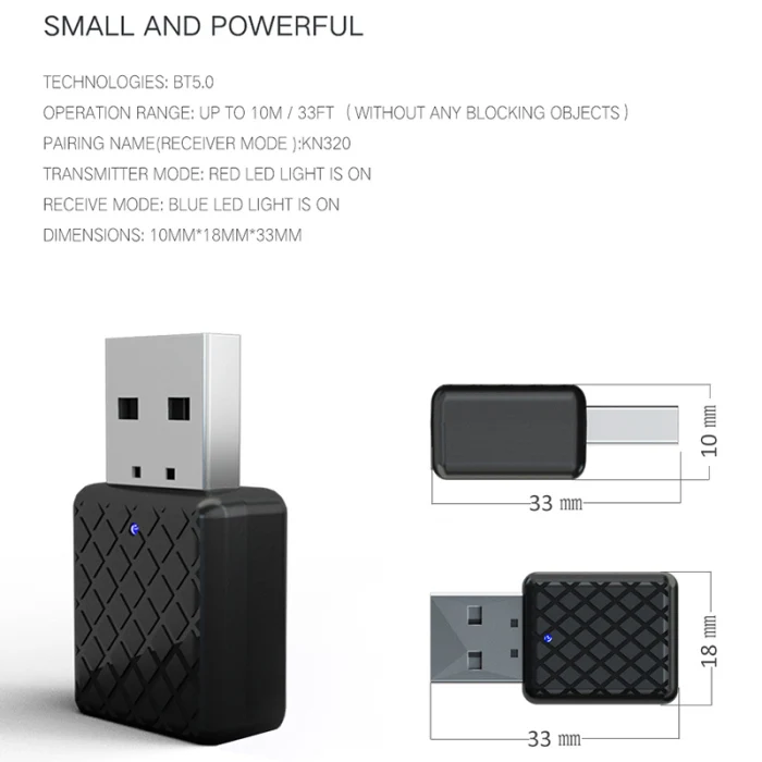 4. Нет встроенного аккумулятора, он питается от постоянного тока 5 в usb интерфейс. Красный светильник мигает при сопряжении в режиме передачи, синий светильник-в режиме приема.