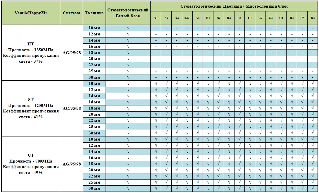 У нас есть: HappyZir HT: 37% прозрачность, 1350МПа HappyZir ST: 41% прозрачность, 1200МПа HappyZir UT:49% прозрачность, 700МПа. Новиники: 3D-Plus Циркон цветный и многослойный. Белый блок + жидкость краски, Цветный, Многослойный блок. Пишите пожалуйста конкретный цвет, который вам надо, наша продавца будет общать с вами.