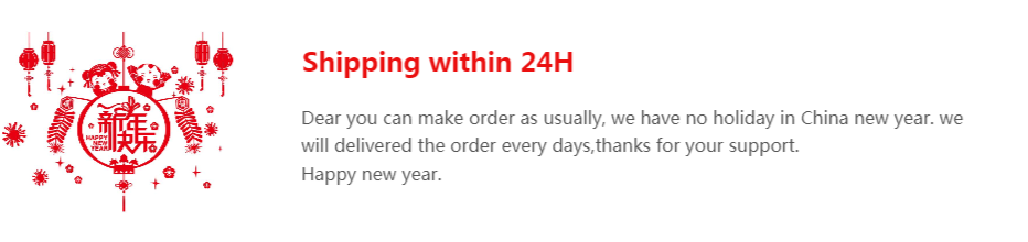 Хорошие новости: В Китае Новый год праздник, наш магазин все еще может доставить заказ. Так что, пожалуйста, просто сделайте заказ как обычно, мы отправим его в течение 24 часов, спасибо, Счастливого Нового года для вас.
