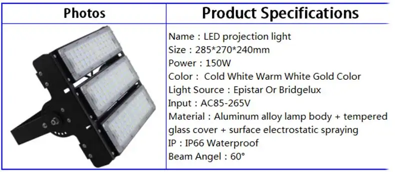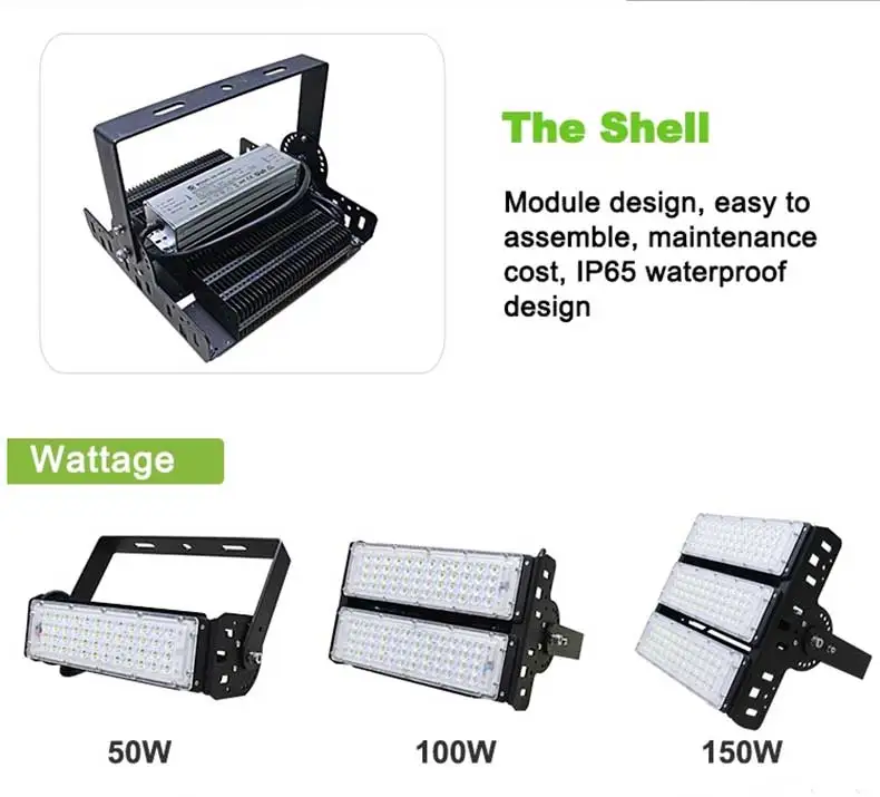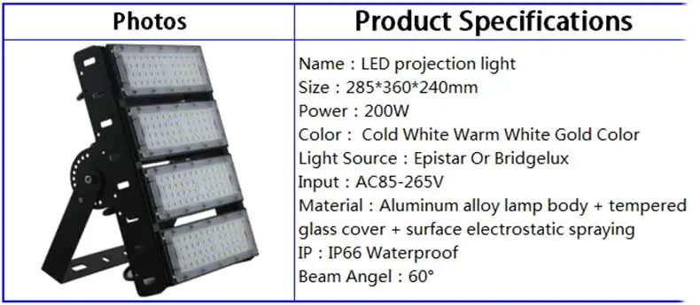 Мощность: 400 Вт/300 Вт/250 Вт/200 Вт/150 Вт/100 Вт/50 Вт Напряжение: 200-240VAC для евро, Азии, Африки, Южной Америки/100-277VAC для США, Канады рынка; (мы решим входное напряжение в качестве страны клиента) Эффективность люменов: 130 лм/Вт драйвер: Meanwell Светодиодный: Refond SMD3030 Индекс цветопередачи: Ra80; Коэффициент мощности: >PF0.9; IP65 водонепроницаемый CCT: теплый белый 3000K, натуральный белый 4000K, дневной белый 5000K, холодный белый 5700K / 6500K Угол луча: 90 ° (если требуется 60 градусов, пожалуйста, оставьте сообщение) Рабочая температура: -40 °C - 50 °C Срок службы: 80000 часов 3 года гарантии