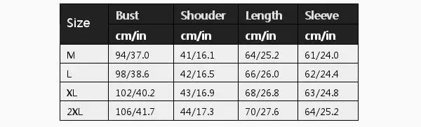 | Размер::2XL | Бюст (см/дюйм)::106/41.7 | Shouder (см/дюйм)::44/17.3 | Длина (см/дюйм)::70/27.6 | Рукав (см/дюйм)::64/25.2 |