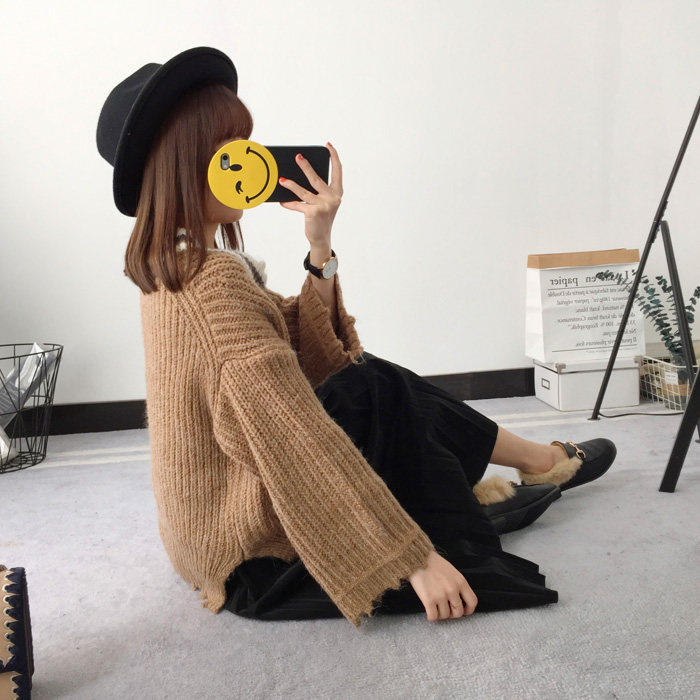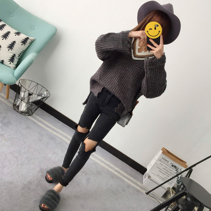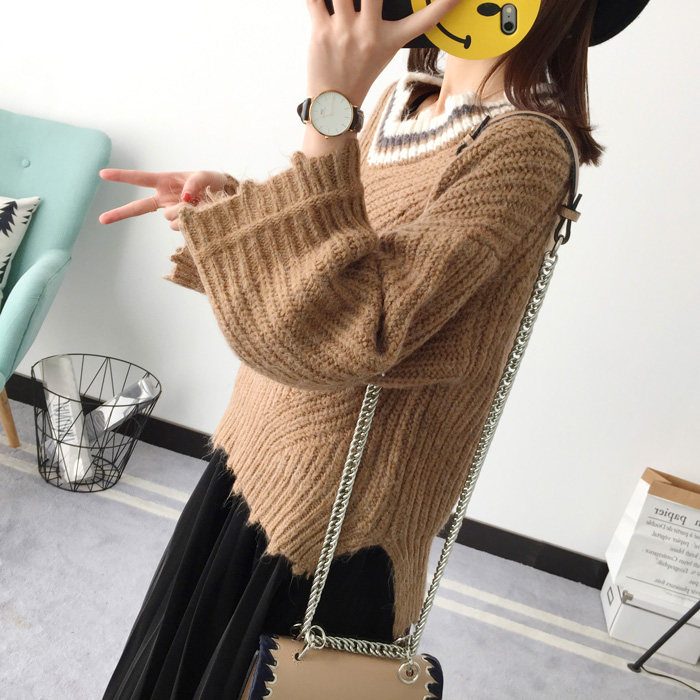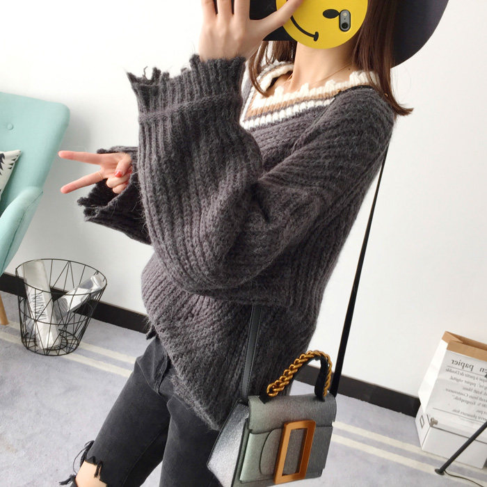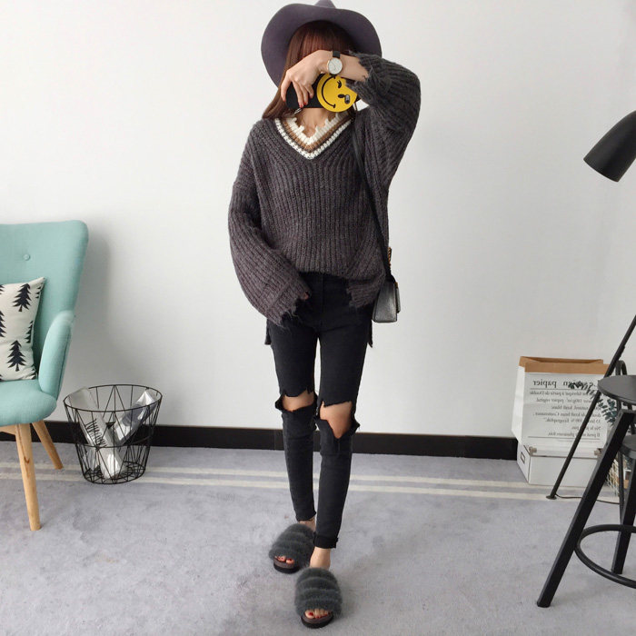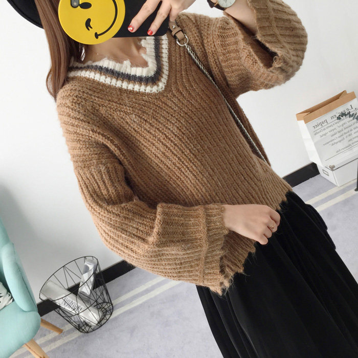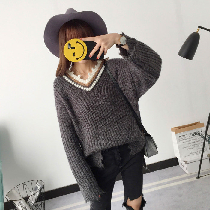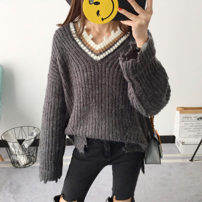 Осенне-зимний Новый стильный свитер с V-образным вырезом Женский однотонный