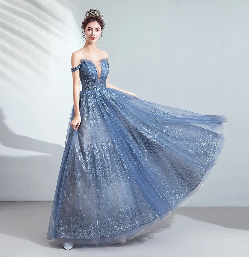 Синие Блестящие платья с блестками для выпускного вечера с открытыми плечами Тюль А-силуэт вечерние праздничные платья vestido largo fiesta Walk рядом с вами