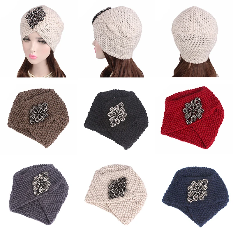 Мусульманская женская Зимняя шерстяная вязаная шапка-тюрбан со стразами, Шапка-бини для сна