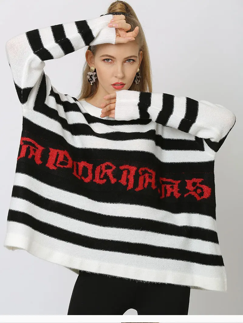 Свитер оверсайз, женское платье-пуловер в полоску, Повседневная вязаная одежда в Корейском стиле с буквенным принтом, черный, белый цвет