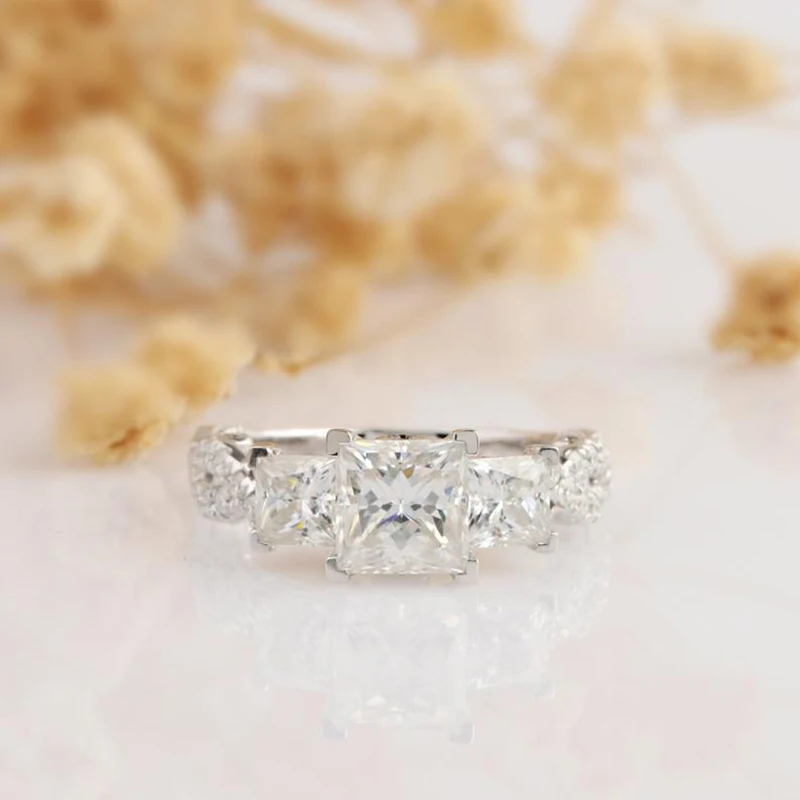※ Матовый тип: ТВЕРДОЕ ЗОЛОТО 14 к. ※ Центральный камень: Муассанит ※ Вес в каратах: огранка принцессы-1 шт * 1,20 CT (6*6 мм), 2 шт * CT (4*4 мм) ※ Цвет: F ※ Четкость: VVS1 ※ Боковые камни: Муассанит (цвет EF, четкость VVS1)