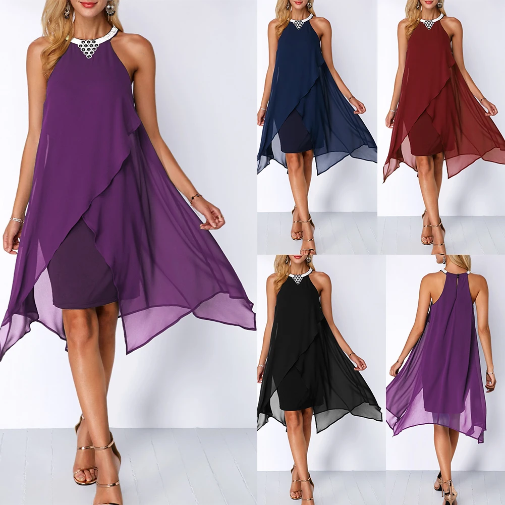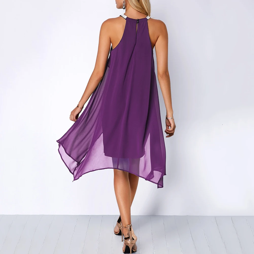 Модное летнее женское платье без рукавов с круглым вырезом и металлическим ожерельем, асимметричное Двухслойное шифоновое платье миди, пляжные вечерние платья свободного кроя