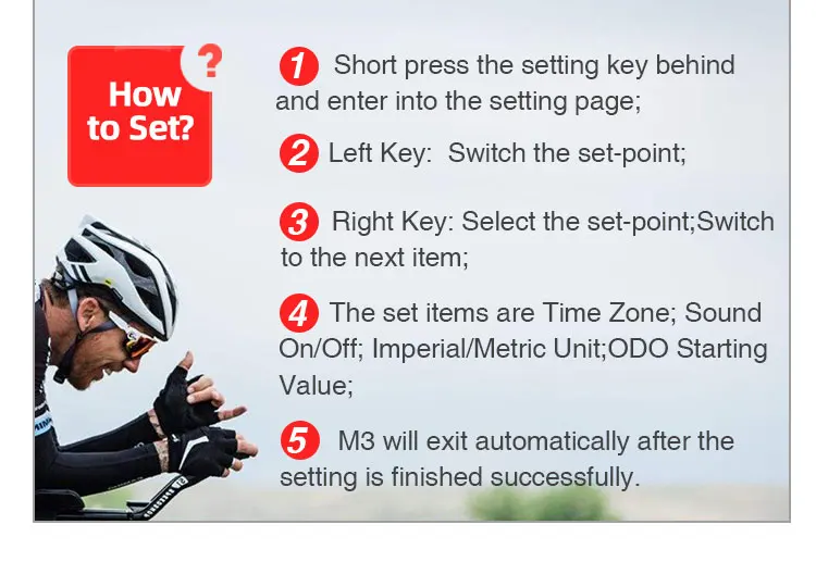M3 GPS велокомпьютер должен только установить часовой пояс. Время и дата будут автоматически синхронизированы.