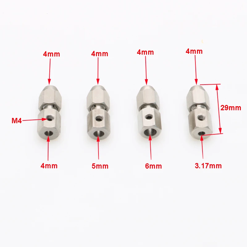 2PCS 3.17x4mm 4x4mm 5x4mm 6x4mm Collet Coupler 4mm Flex Cable Shaft Motor Chuck Coupling Connector Parts for RC Electric Boat Suitable for 4mm flex shaft ,3.17/4/5/6mm shaft motor Material: stainless steel Package includes: 2pcs x Collet Coupler