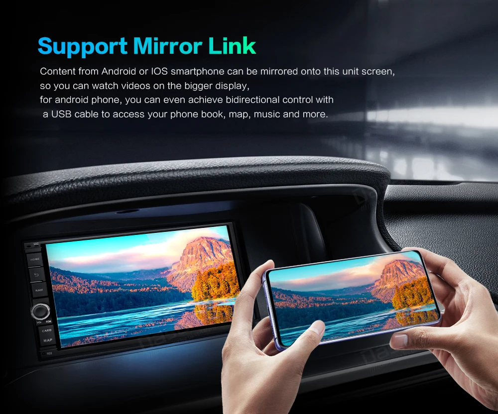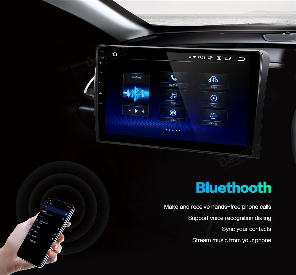 С функцией распознавания голоса и функцией телефонной книги. Вы можете синхронизировать имена телефонных книг с вашего мобильный телефон на этот блок и сделать мобильный телефон без рук удобным и быстрым. Вы можете передавать музыку с вашего телефона через Bluetooth и наслаждаться множеством песен, которые вам нравятся