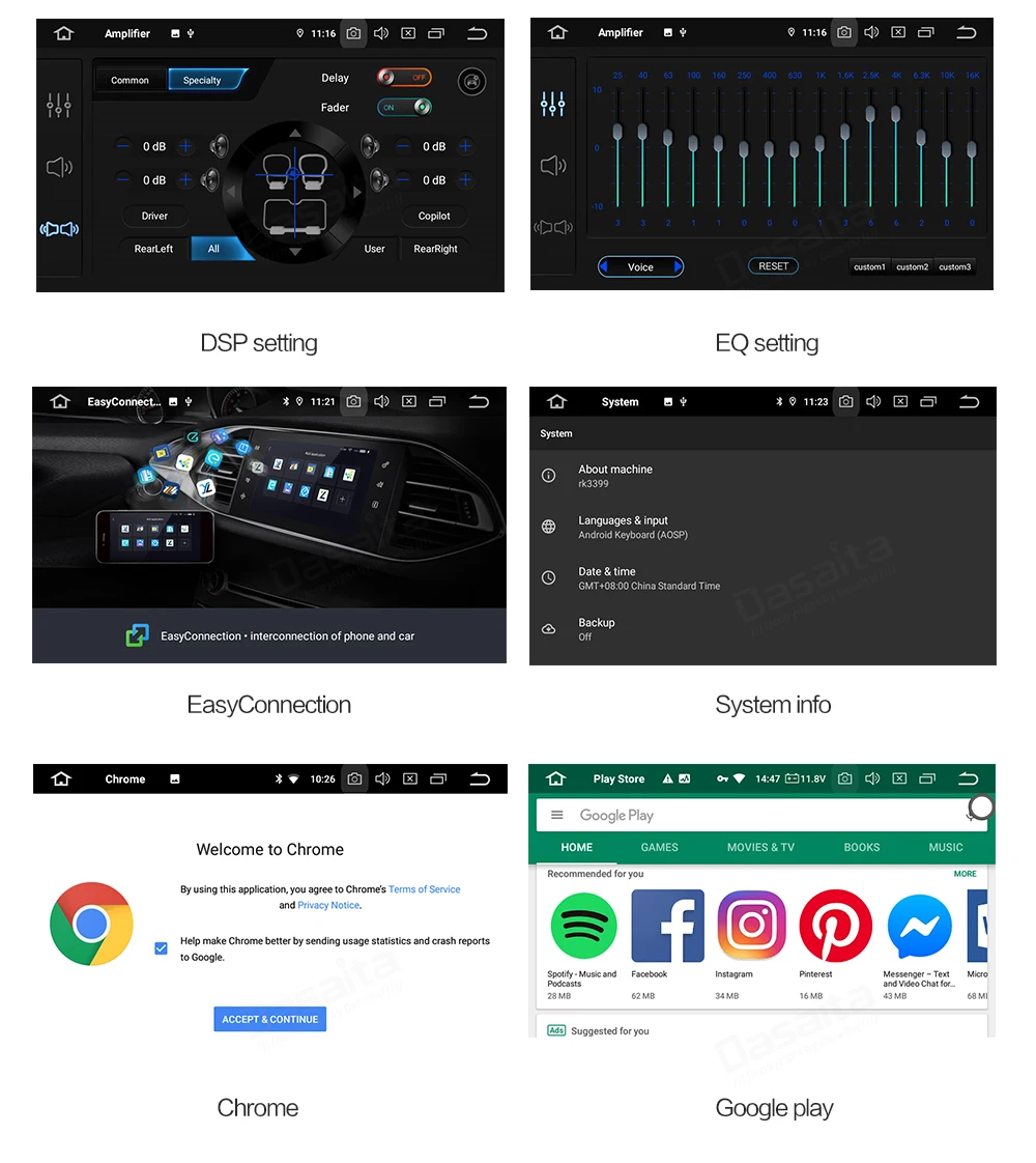 ОС: Android 10 Pie Процессор: RK3399, двойной Cortex-A72 + Quad Cortex-A53, 64-разрядный процессор ОЗУ: 4 Гб a ROM : 64 ГБ Графический процессор: Mali-T860MP4 Радио: ST7708 Bluetooth : CSR BC6 Разрешение: 1024*600 Экран: IPS Кнопка подсветки: RGB
