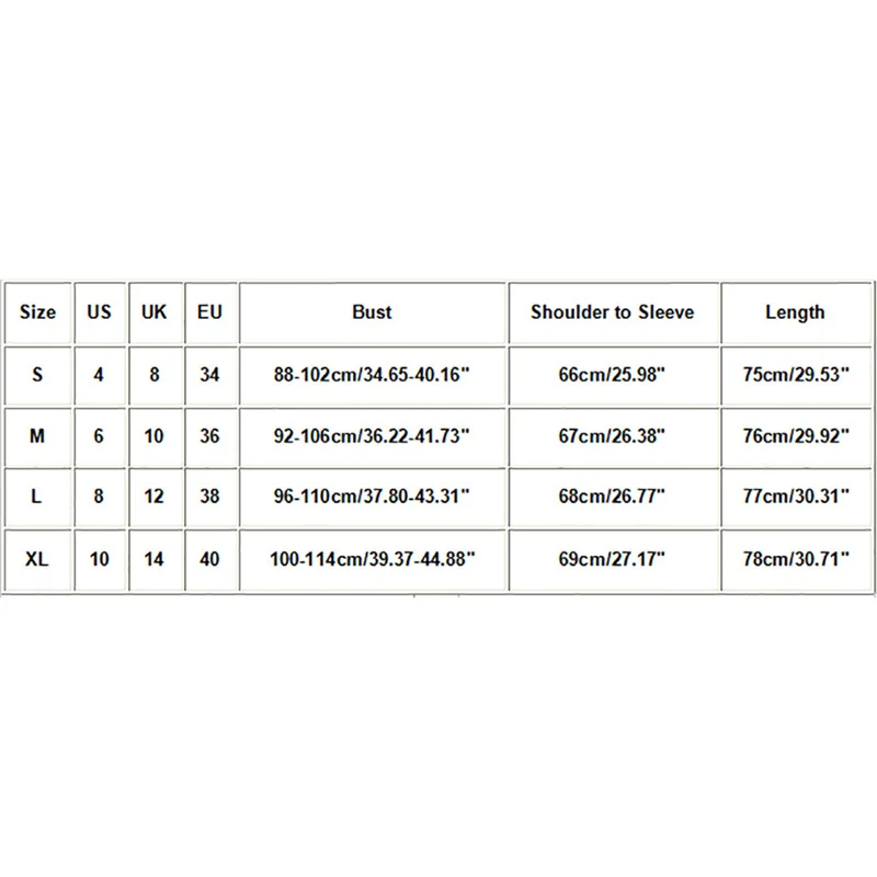 | Размер: S | США: 4 | Великобритания: 8 | ЕС: 34 | Обхват груди: 88-102 см/34,65-40,16 дюйма | От плеча до рукава: 66 см/25,98 дюйма | Длина: 75 см/29,53'' |