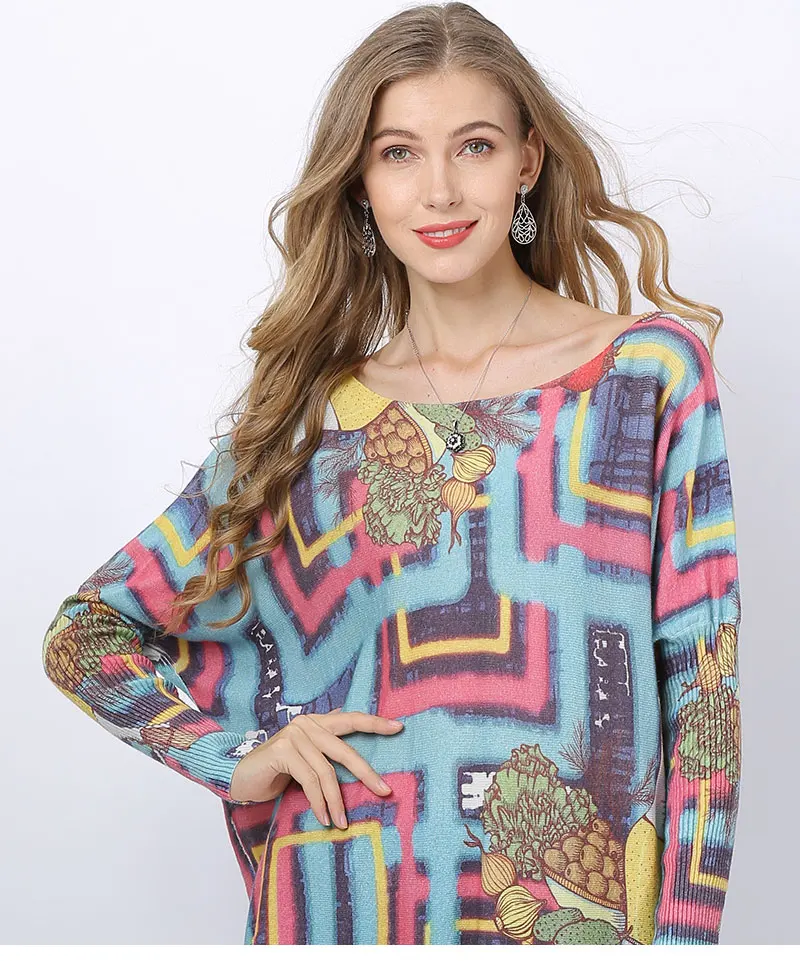 Новинка 2020, вязаный свитер с лабиринтом фруктов, женский зимний джемпер, лоскутное платье большого размера с принтом, шерстяной пуловер с круглым вырезом