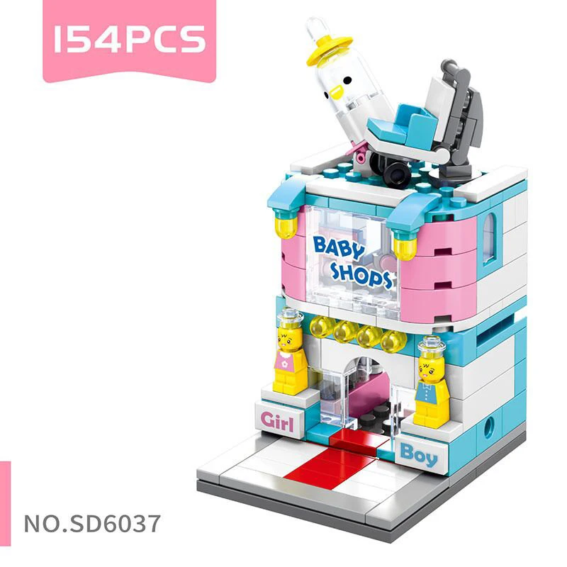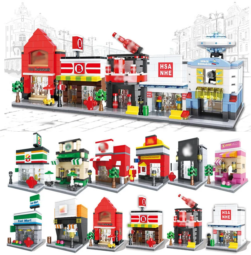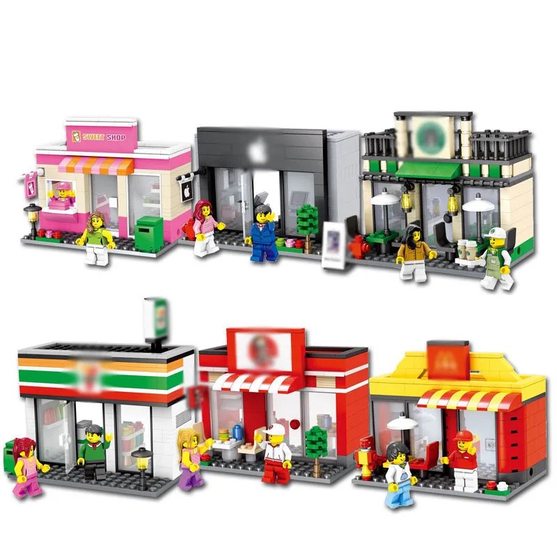 Городской уличной архитектурной модели строительных блоков Основной продукт: сладкий магазин, магазин Apple, кофейня, розничный магазин, магазин фаст-фуда Будоражит воображение ребенка, развивает интеллект Детские упражнения с помощью рук и мозга