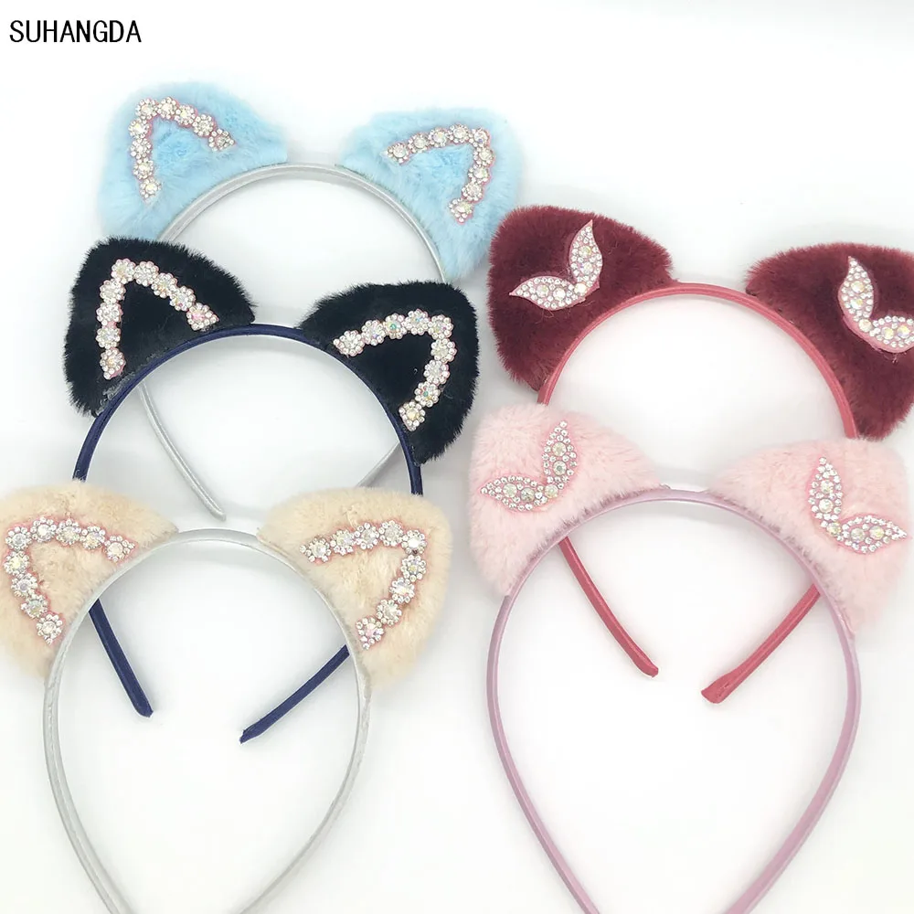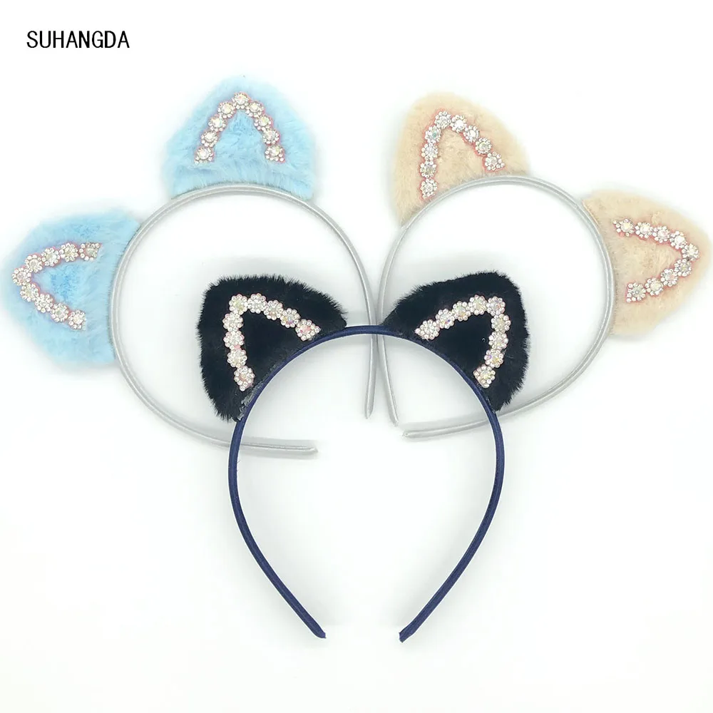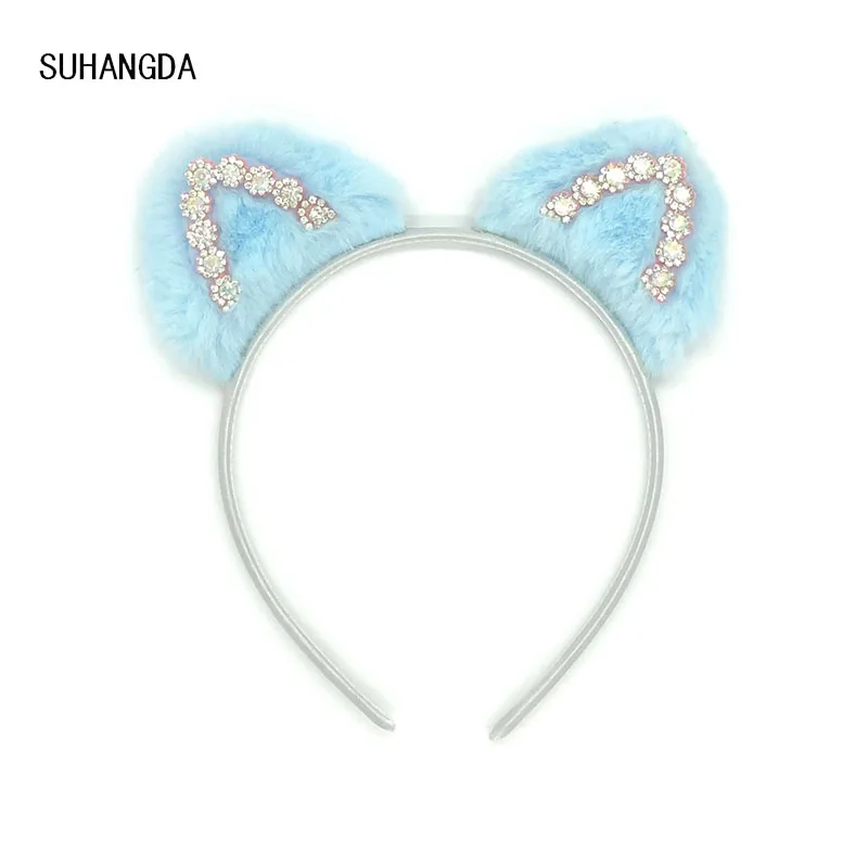 Лидер продаж плюш кошачьи уши Детская повязка для волос цветная повязка на голову Блестящий горный хрусталь для милых девочек аксессуары для волос