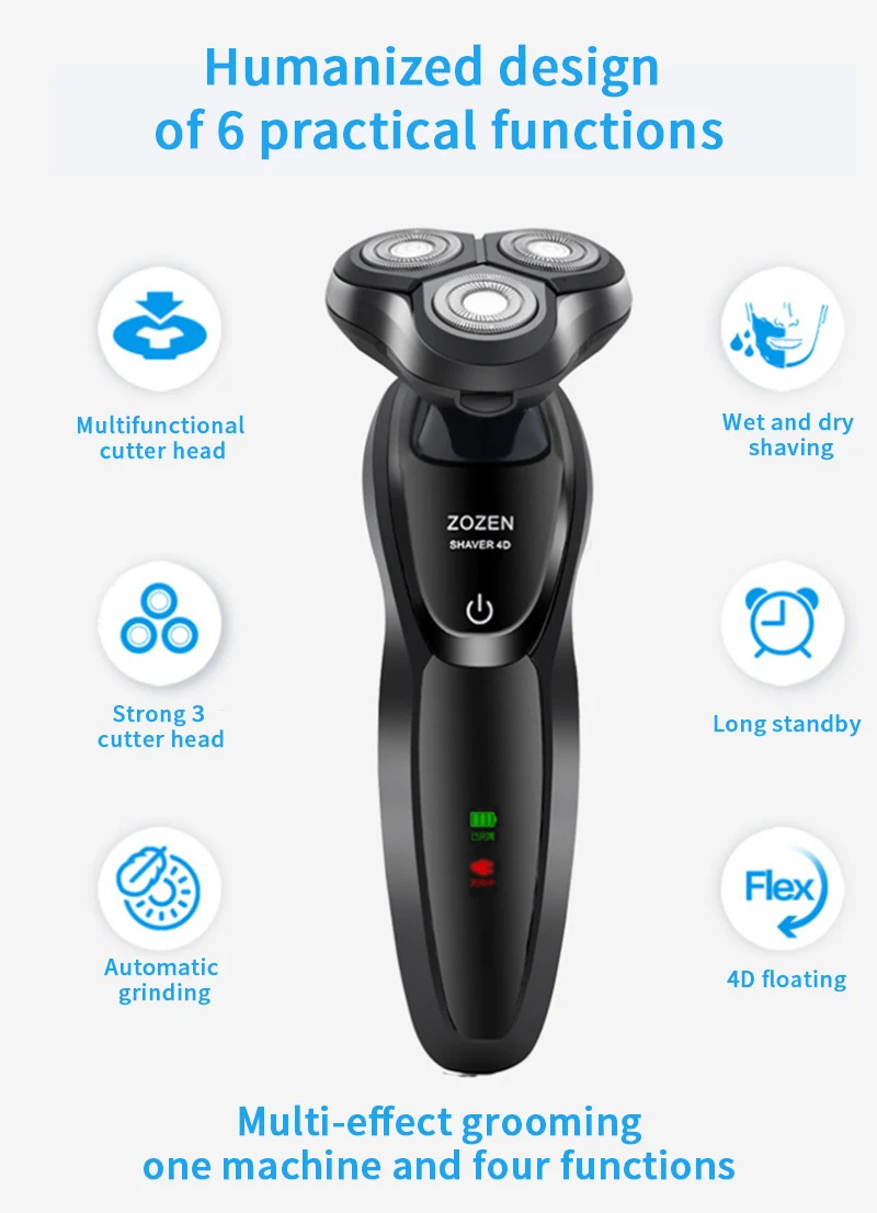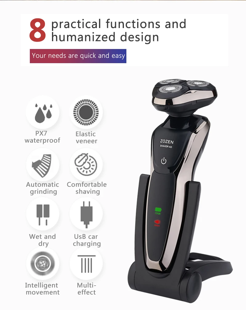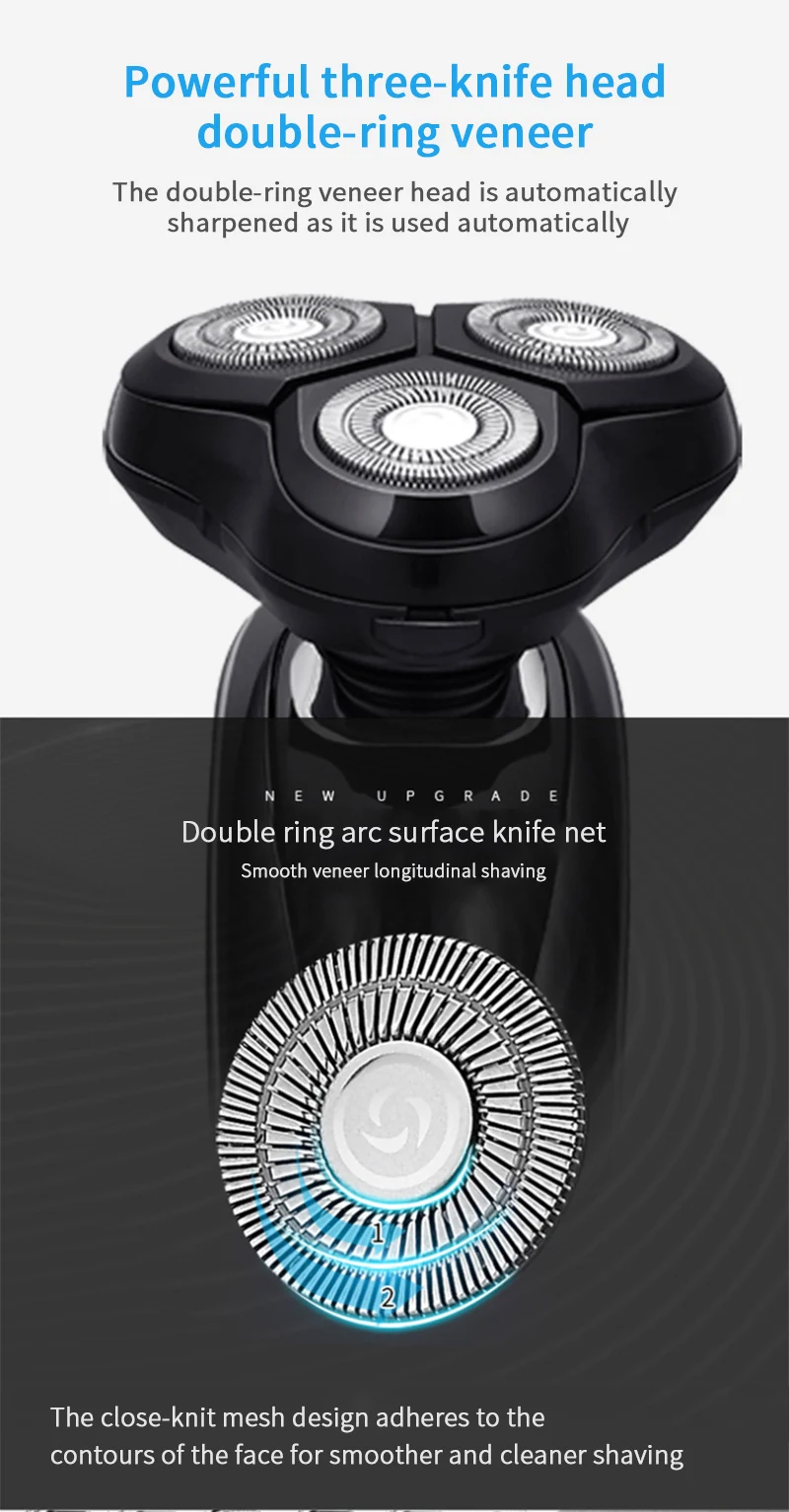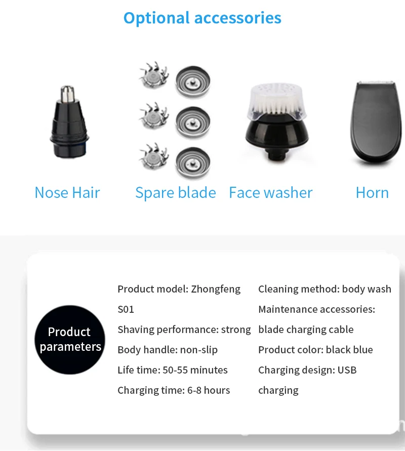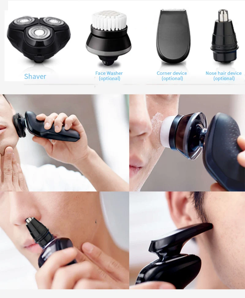 1: мульти-эффекты, один станок для четырех (бритвенная головка, угловой нож, триммер для волос в носу, щетка для лица) 2: Замачивание, мытье тела, легко чистить 3: прочная трехножевая головка, двухкольцевая шпона режущая головка, автоматическая шлифовка, шпоновая сетка для ножей, контур лица, футболка более гладкая и чистая 4: разделяемая и Разобранная режущая головка, легко моется и заменяется 5: полностью автоматическая интеллектуальная антизажимная микросхема автоматически определяет состояние батареи, низкий уровень заряда может также обеспечить скорость двигателя 6: Универсальное напряжение, USB зарядка для USB, мобильного телефона, компьютера, автомобиля и других usb-интерфейсов