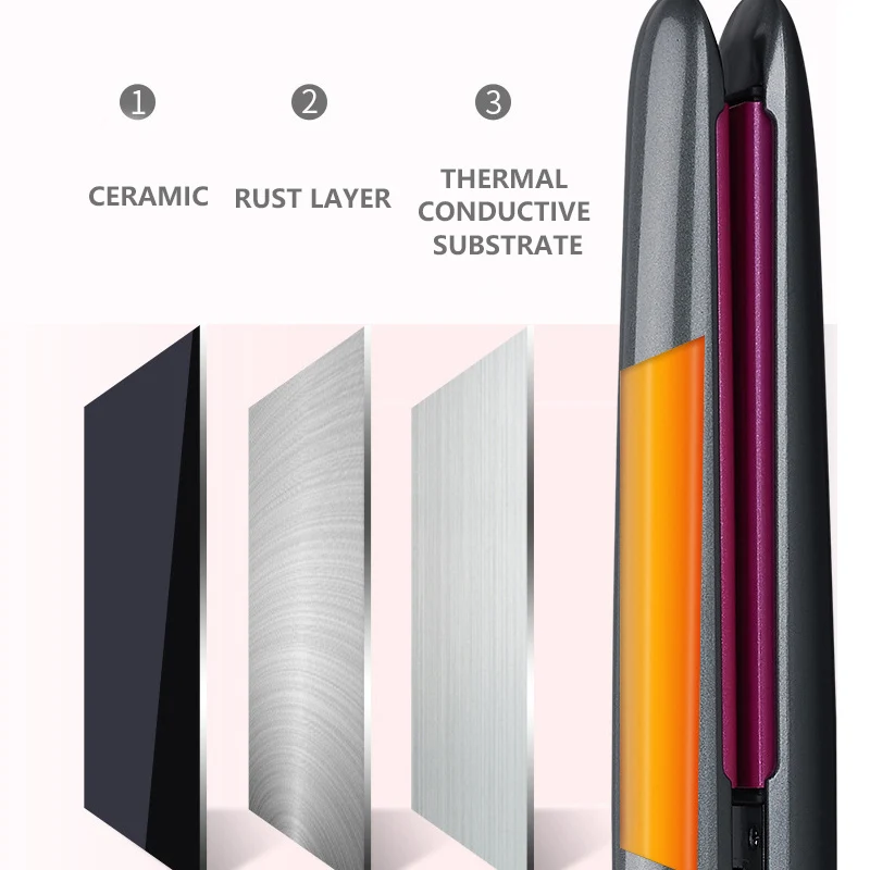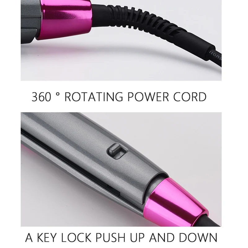 Особенности: скручивающаяся двухцелевая турмалиновая керамическая нагревательная панель, функция по уходу за волосами с отрицательными ионами, инфракрасная восстанавливающая краска для волос, высококачественный корпус из углеродного серого цвета;