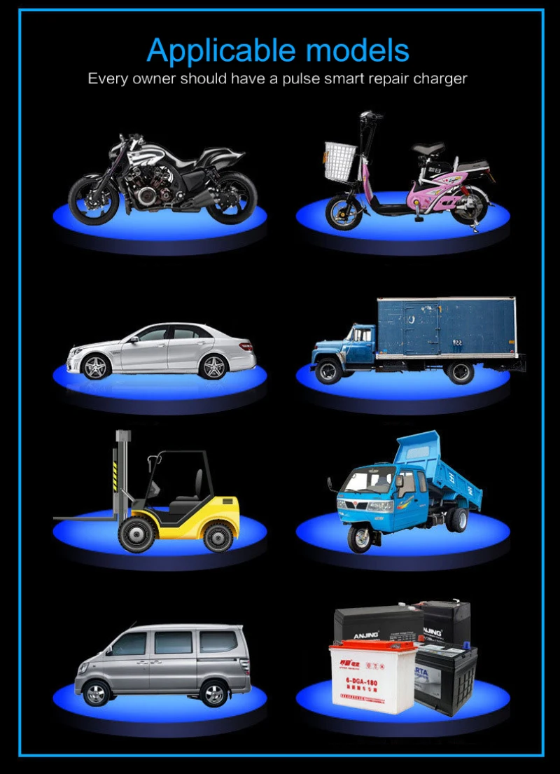 Charging Range: Applicable to 12V, 24V, 6AH-200AH batteries on the market (except lithium-iron batteries)