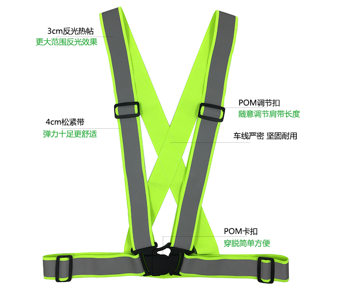 Product Name: reflective vest / reflective clothing Fabric: polyester Oxford cloth / knitted fabric Standard: Our products through the SS EN ISO 20471 certification Composition: elastic reflective tape + plastic buckle + button on the word Size: Width 4cm * 1.5cm, shoulder strap total length: 115cm. belt length: 125cm. Waist range of about: 62- 110cm Packing: opp bag Color: light green, orange Carton: 52cm * 39.5cm * 27.5cm opp bag packaging 100 / box
