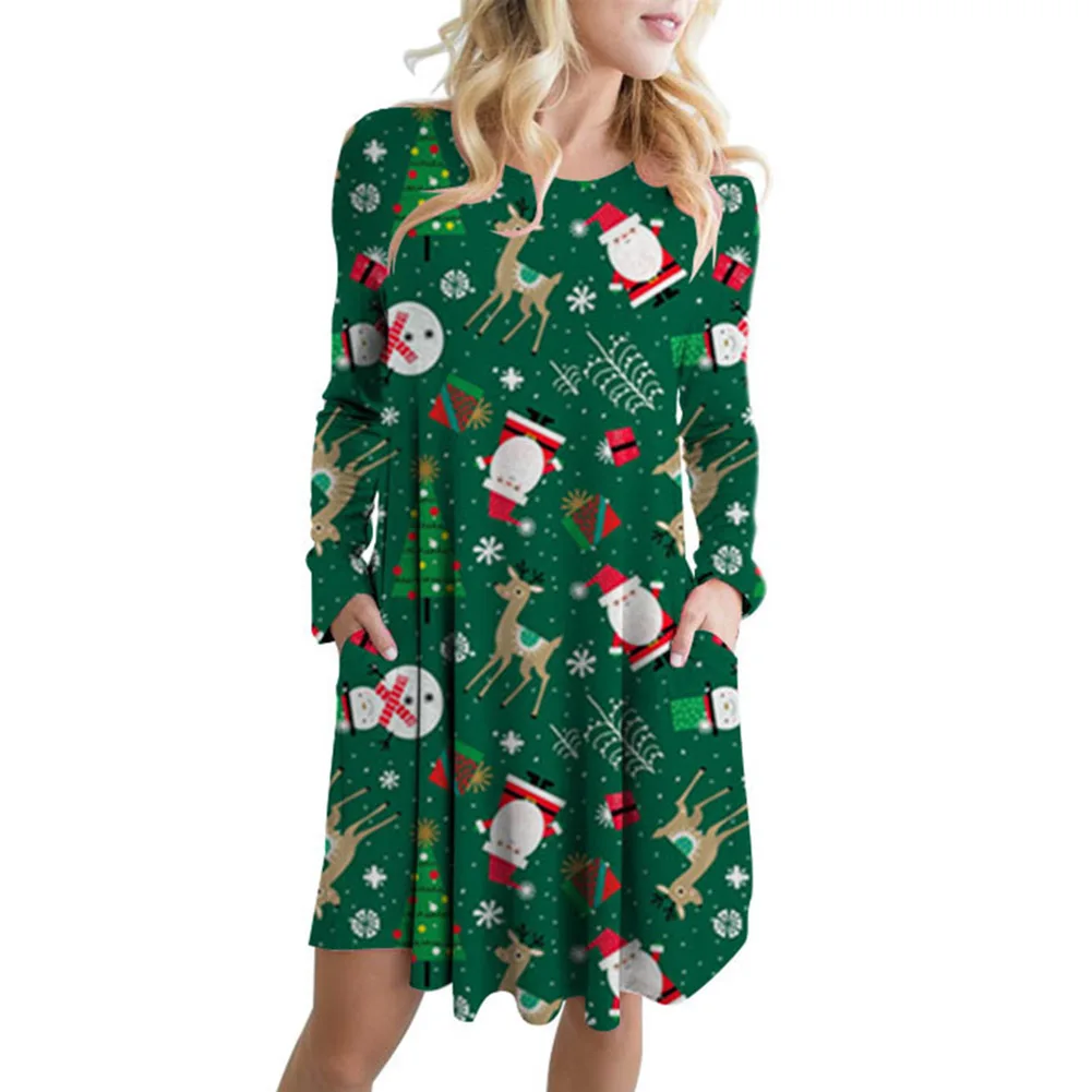 Рождественское женское платье средней длины с Санта-Клаусом и оленем, о-образным вырезом, длинным рукавом и карманом