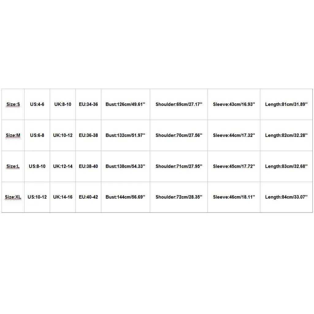 | Size | US | UK | EU | Bust | Shoulder | Sleeve | Length |