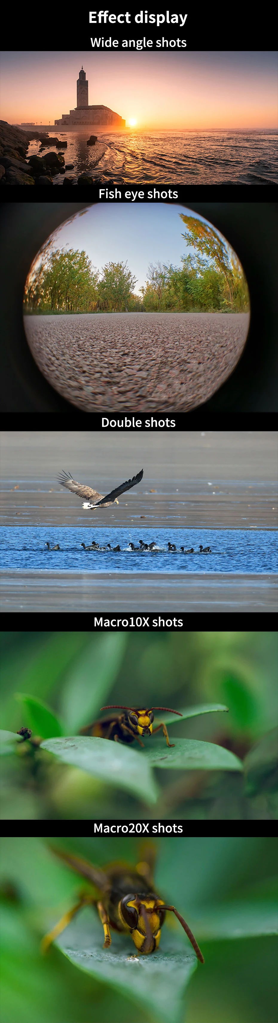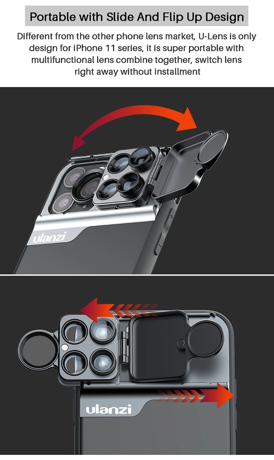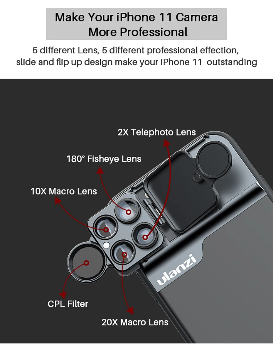 Специально разработан для iPhone 11 Pro Max, Pixel 4 4XL в комплекте чехол для телефона. Система объективов 5 в 1 привнесет ваш iPhone 11 профессиональный эффект съемки. Простота в использовании: портативный, с выдвижной и перекидной конструкцией, быстро переключается на разные объективы с выдвижной конструкцией и поставляется с крышкой объектива для защиты объектива. 1. Фильтр CPL отлично подходит для удаления нежелательных отражений от неметаллических поверхностей, таких как стекло или вода. 2. Супер макрообъектив фиксирует в натуральную величину изображения самых маленьких объектов с высочайшим качеством. 3. 2 телеобъектива сближают вас для более плотных и четких снимков без использования цифрового зума. 4. Объектив «рыбий глаз» 180 ° предоставляет вам невероятные и драматические округлые изображения, которые переносят вас в потрясающий и фантастический мир. *** Анаморфные линзы 1,33x, нейтральный фильтр и линзы микроскопа от ULANZI уже скоро.