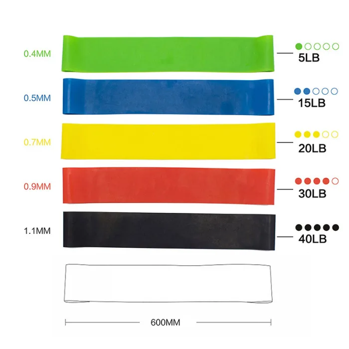 Для каждого упражнения вы можете выбрать полосы для различных уровней растяжения: Дополнительный светильник, светильник, средний, тяжелый и сверхтяжелый.