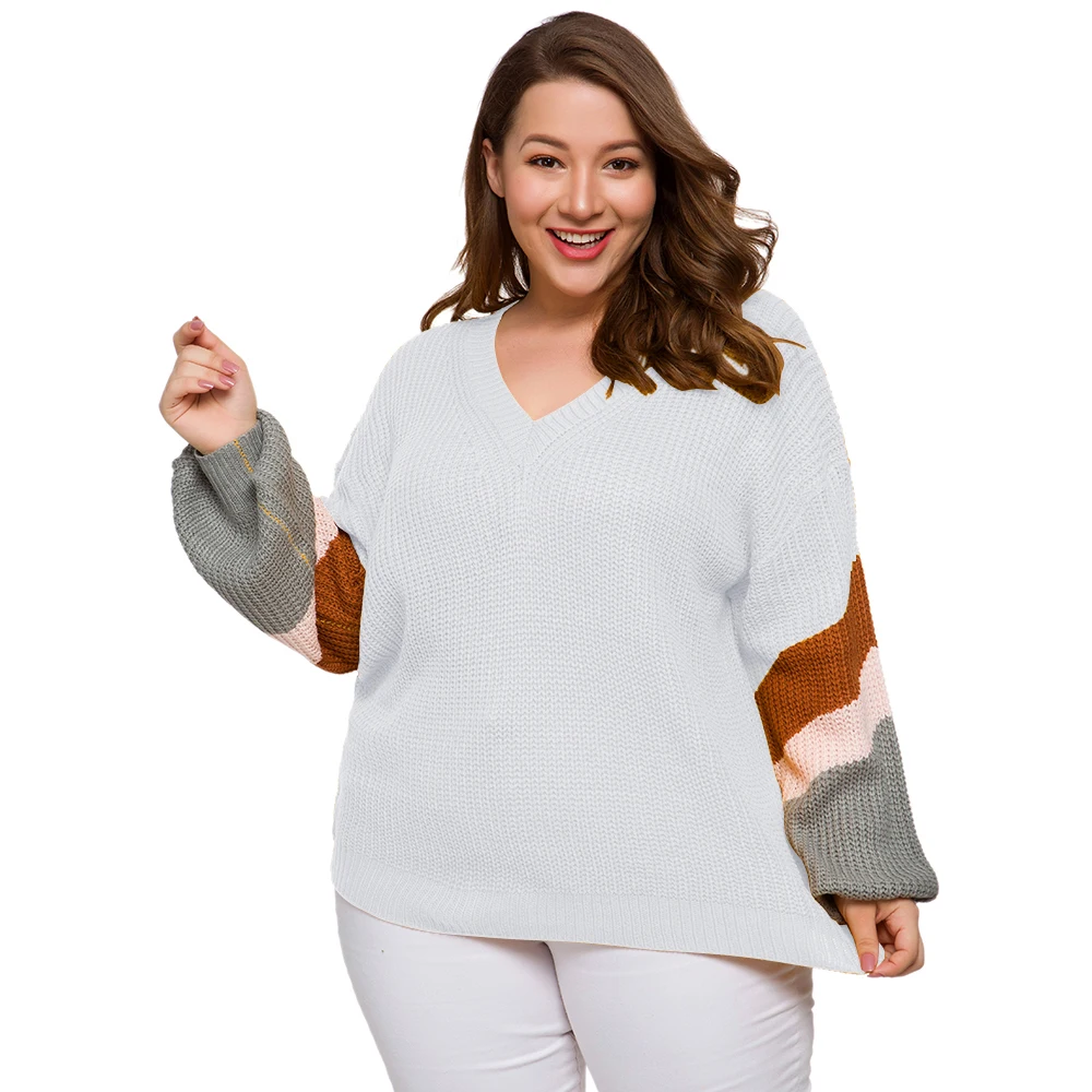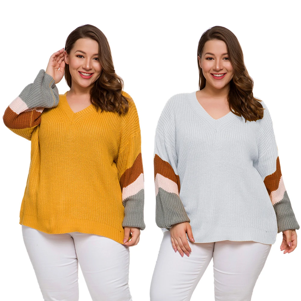 Женский свитер большого размера плюс с длинным рукавом и v-образным вырезом в контрастную полоску в стиле пэчворк, повседневный Свободный пуловер, Осень-зима