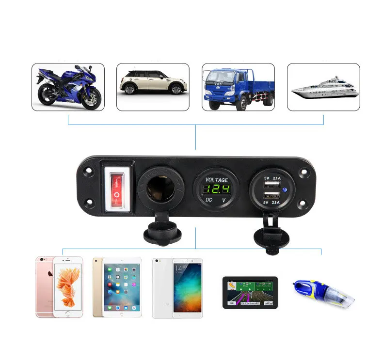 Особенности: 100% новый товар высокого качества. Защита от короткого замыкания/перегрева. Многофункциональный продукт, идеально подходит для путешествий. Со светодиодным вольтметром, прост в использовании. С переключателем вкл/выкл ---- нет необходимости подключать и выключать зарядное устройство, уменьшать износ, увеличивая срок службы устройства. Водонепроницаемый пыленепроницаемый материал может использоваться для внутреннего и наружного применения. Съемный дизайн, можно изменить положение зарядного устройства USB и измерителя напряжения. Легко установить, они сидят на приборной панели и крепятся с 4 винтами (в комплекте). Отлично подходит для iPad,iPhone,iPod,Samsung,Xiaomi,Huawei и многое другое. Установить в любой 12V-24V мотоцикл, лодка, езда косилки, трактора или автомобиля. Применяется ко всем мобильным телефонам с usb-зарядкой или другим электронным продуктам. Запускайте несколько аксессуаров одновременно, очень удобно и просто в использовании. Технические характеристики: Тип товара: 4 USB адаптер зарядное устройство + Цифровой вольтметр с переключателем Материал: АБС + металл Цвет корпуса: черный Светодиодный дисплей напряжения: синий/красный/зеленый (опционально) Размер панели: 18,5 × 4,8 см Длина кабеля питания: 20 см. (1) Зарядное устройство USB: Рабочее напряжение: 12V-24V Интерфейс: 4 порта USB Выход: 5 В постоянного тока 2.1A Индикатор: синий светодиодный -Широко используется с электрическим оборудованием для источника питания: транспортное средство, GPS, мобильный телефон, камера, mp3 (не может курить) -Позвольте любому автомобилю с подключением к прикуривателю использовать с этими поверхностными гнездами для сигарет. (2) измеритель напряжения: Рабочий диапазон: 6-30 В постоянного тока Дисплей: светодиодный цифровой дисплей Измеритель легко читает красные светодиодные сегменты и подключается к системе 12 вольт Количество: 1 комплект (другие демонстрационные аксессуары на рисунке не включены) Примечание: 1. Перевод ед. измерения: 1 см = 10 мм = 0,39 дюймов 2. Допускается погрешность в 0-1 см из-за ручного измерения. Пожалуйста, убедитесь, что вы не возражаете, прежде чем сделать ставку. 3. Из-за разницы между различными мониторами изображение может не отражать фактический цвет изделия. Спасибо! 4. Нет розничной упаковки Пакет включает в себя: 1 X Четыре USB Автомобильное зарядное устройство адаптер со светодиодным вольтметром 4 х винтов