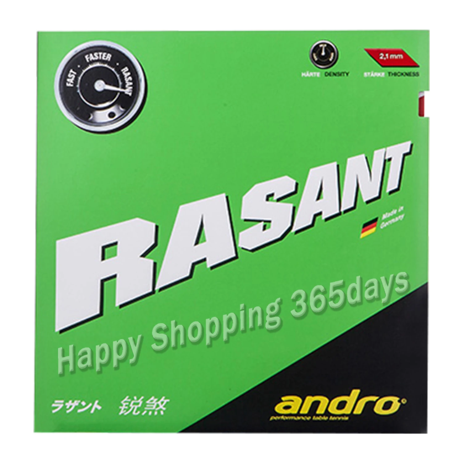- Fast, faster, RASANT!Experience RASANT's compact play feeling caused by the unique, fine-pored green sponge!Disarm your opponent's spin by using the newly developed RASANT top sheet and kick-start your own, more dynamic topspin!Step up your stroke efficiency! - Trigger toxic, better spins with an aggressive spin curve!Change the game to your favor! Take your performance to a higher level! Play RASANT by andro! Speed: 113 Spin: 110 Control: 80 Thickness: 2.1