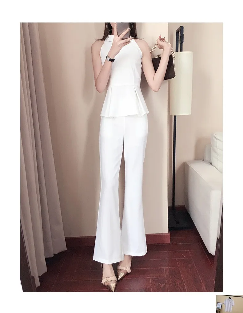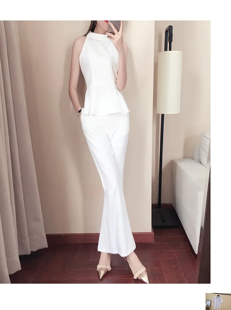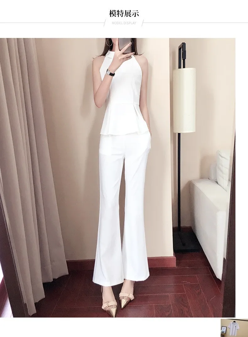 Женский комплект 2 шт. блузка без рукавов и широкие брюки костюм 2020 новые летние элегантные женские белые комплекты брюк с рюшами AE904