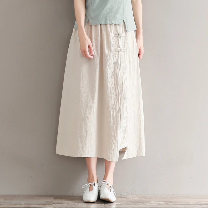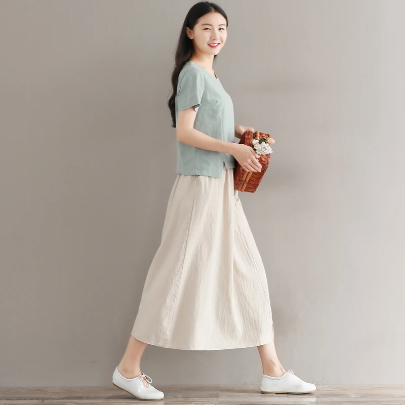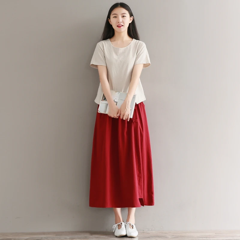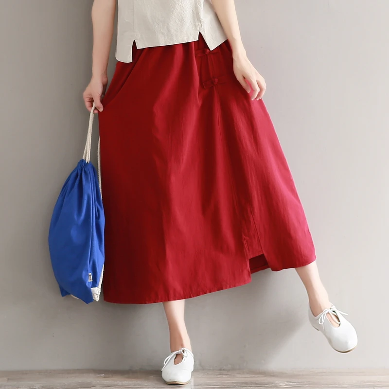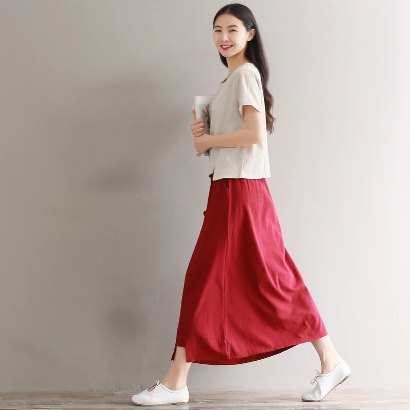 Абрикосовые, красные, летние длинные юбки, чистый цвет, длинные юбки для женщин, эластичная талия, хлопок и лен, винтажная юбка, Япония, Mori Girl, AE588