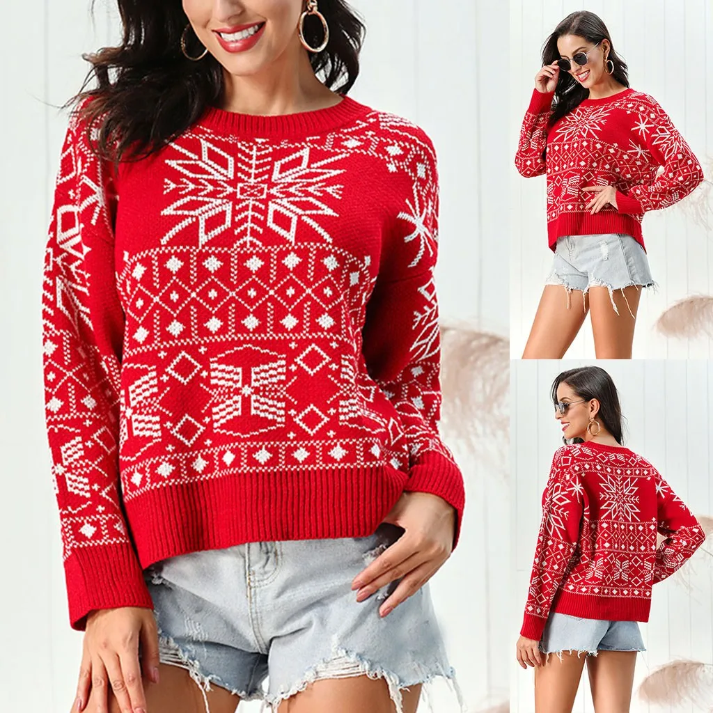 Women Christmas Geometric Pattern O-Neck Long Sleeve Pullover Snowflake Sweater