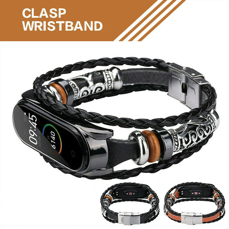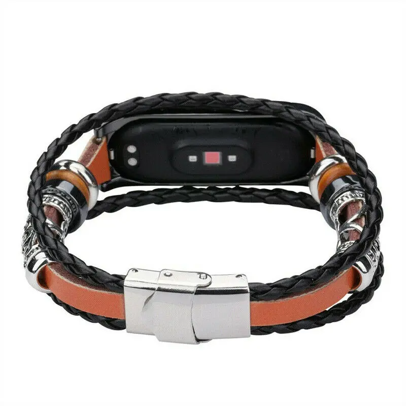 Высококачественная кожа, приятная на ощупь и прочная.Превосходное мастерство, гибкие и удобные в носке.Уникальный дизайн плетения с декором из бисера, сделает вас более привлекательным.Металлические соединители премиум-класса бесшовно сочетаются с устройством как оригинальными.Легко устанавливается и снимается.Технические характеристикиМатериал: кожаЦвет: черный/коричневыйДлина ремешка: 230 ммСовместим с: Xiaomi Mi Band 3/Xiaomi Mi Band 4Посылка включает в себя:1 * ремешок для часов (трекер в комплект не входит)"
